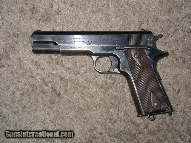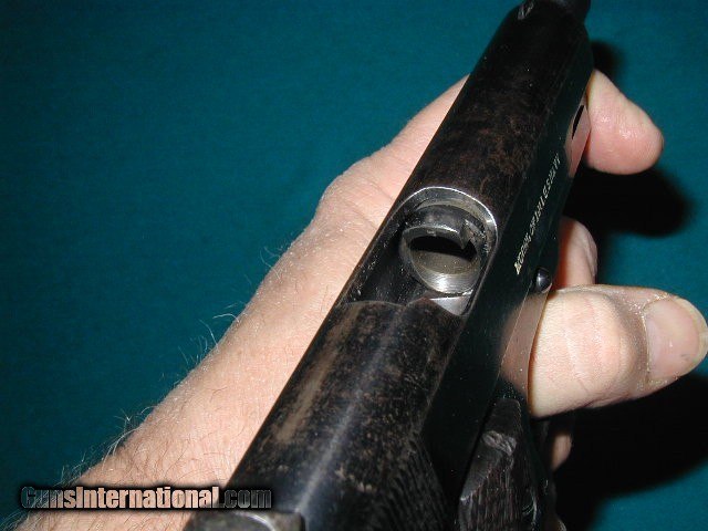 Description: THIS IS A VERY EARLY COLT 1912 U.S. NAVY IN THE 30XX RANGE. IT HAS A MIXED FINISH OF BRIGHT BLUE, PLUMB AND BROWN GRAY, WITH SOME LIGHT OXIDATION IN PLACES. THERE IS SOME TOUCH UP ON LEFT FRONT OF SLIDE FROM SOME PREVIOUS CLEANING. ALL CORRECT EARLY PARTS THROUGHOUT INCLUDING A SIDWAYS SERIF H BARREL...VERY FROSTY WITH GOOD RIFLING. GOOD GRIPS.....OVERALL A MUCH BETTER THAN AVERAGE VERY EARLY , FAIRLY RARE COLT 1911 NAVY. PHOTS TAKEN INSIDE WITH FLSAH....C&R OK. SOLD Curio/Relic: Yes |