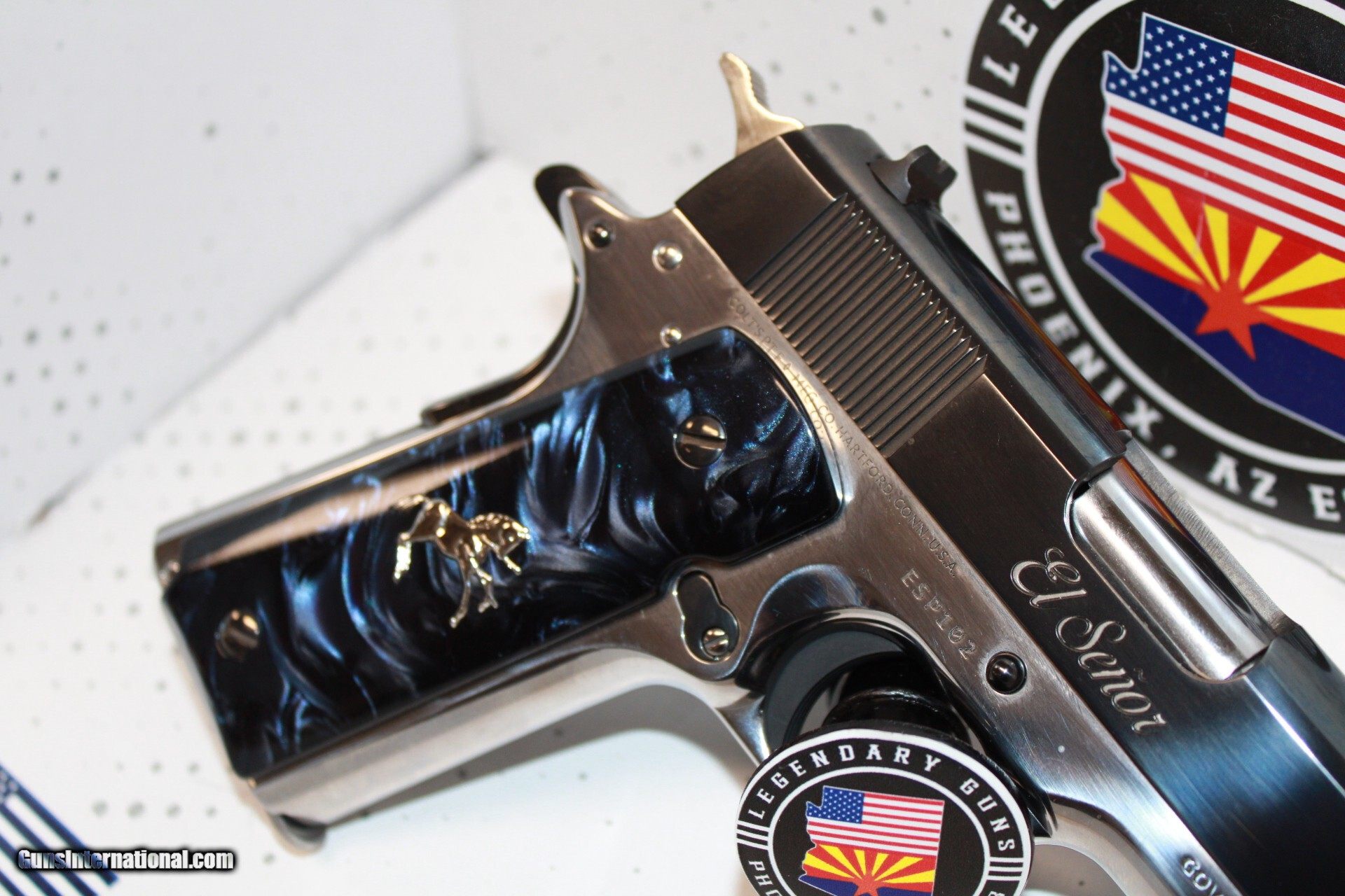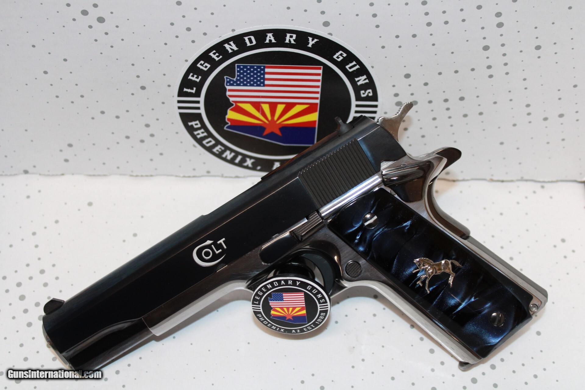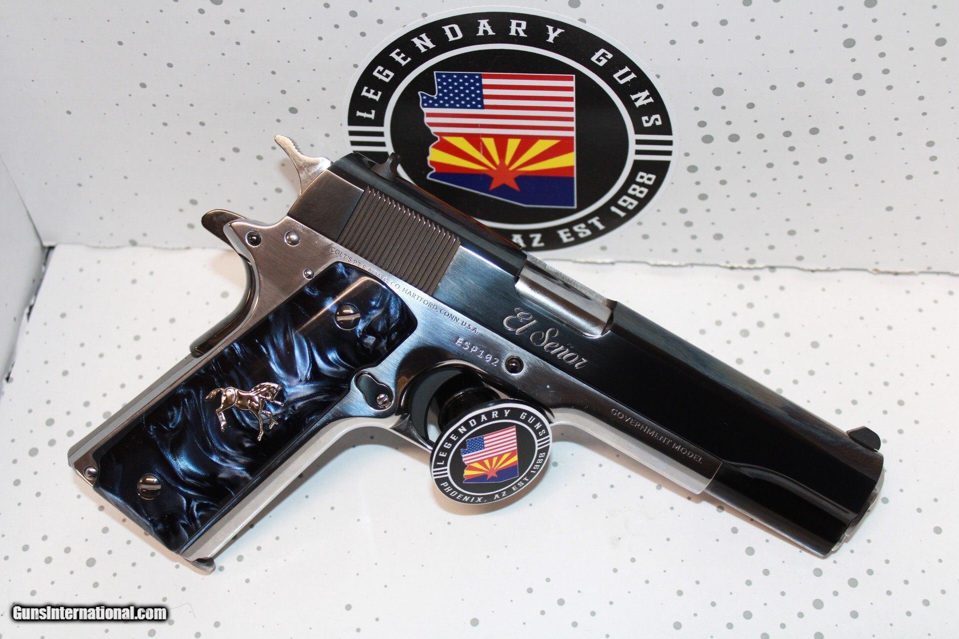 Description: Colt 1911 El Senor in 38 Super with a 5" barrel, High polished blued slide with retro Colt rollmark and El Senor marking, polished stainless frame. Pistol is brand new with box. 1 of 500 made. *Legendary Guns in Phoenix AZ 602-242-1195 Hours of operation Tuesday-Friday 10-6 Sat 10-5 Closed Sundays & Mondays *We accept all Major credit cards. We DO NOT charge an additional fee for Credit Cards. We also accept Postal Money orders or Certified Bank Checks{Check & Money order payments must arrive within 7 days of initial agreement and will be held for 3 days before items are shipped} *Shipping is $50 for rifles/shotguns {AK & HI Extra} and $35 for handguns. Arizona Residents Must Pay Sales Tax. We DO NOT ship Internationally. *We offer a 60 day layaway on purchases of $500 or more. Items require 1/3 of the total price as down payment which is NON-REFUNDABLE and you have 60 days to pay off the balance. *Please call or email with any questions and to confirm availability before buying. We are happy to answer all questions. All items listed are also for sale at our Phoenix, AZ location *We offer a 3 day inspection period on USED FIREARMS ONLY, We accept returns within the 3 day inspection period with NO REFUNDS ON SHIPPING CHARGES and a 10% restocking fee. *Trades are welcome for customers who can visit our Phoenix, AZ location, We DO NOT engage in online or mail in trades. Handgun Caliber: .38 Super Auto Manufacturer: Colt Model: 1911 Condition: New Price: $2,499.00 Shipping: $35.00 Contact Seller |