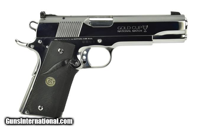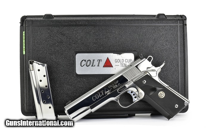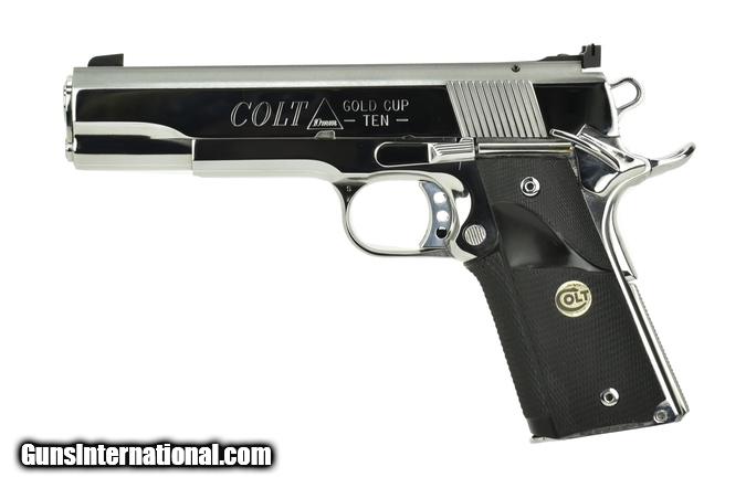 Colt Gold Cup 10mm caliber pistol. Scarce 10mm Gold Cup with custom bright polished finish. Excellent condition with case and magazine.