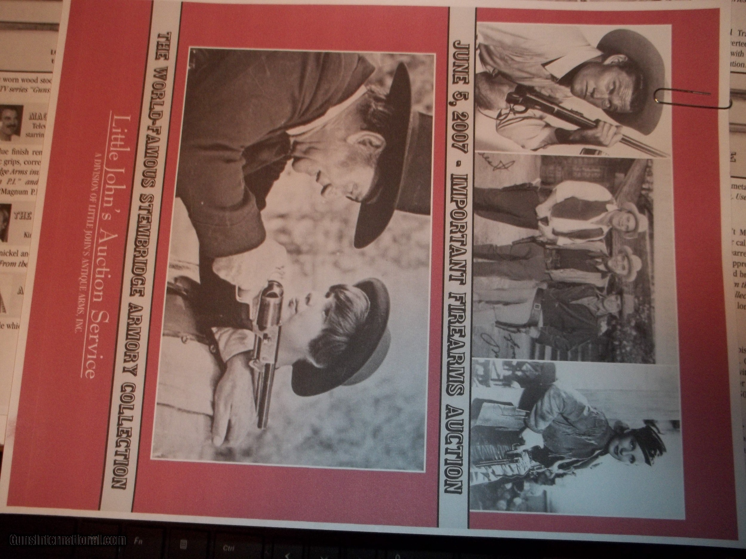 Description: Colt 1911 Gold Cup.National Match...45ACP...Mfg. 1993...This pistol features blade front and adjustable rear sights...Slide lacks markings and has been fitted with a blank firing 5 inch barrel...Colt markings and serial number are stamped on the right side of the frame..Rare Nickel finish .Frame and Slide .. Matted finish top of Slide....Pistol is fitted with checkered Walnut grips with gold Colt medallions...Magazine is absent...Overall Gun is in very good condition...This pistol is attributed to the 1994 Movie " The Getaway" staring Alec Baldwin and Kim Basinger. and was used by Ms. Basinger in the film... It is listed by serial number in the June 5,2007 Little John's Service Catalog, Listing the World-Famous Stembridge Armory Collection..Page 40....Lot number 153...Copy of catalog pages pertaining to this gun are included, as is a Still photo of the Movie Poster showing the gun...Personal Check or Money Order...Layaway Available...To use Layaway please contact us at " (352) 351-0830...Shipping and insurance $ 45.00 SOLD |