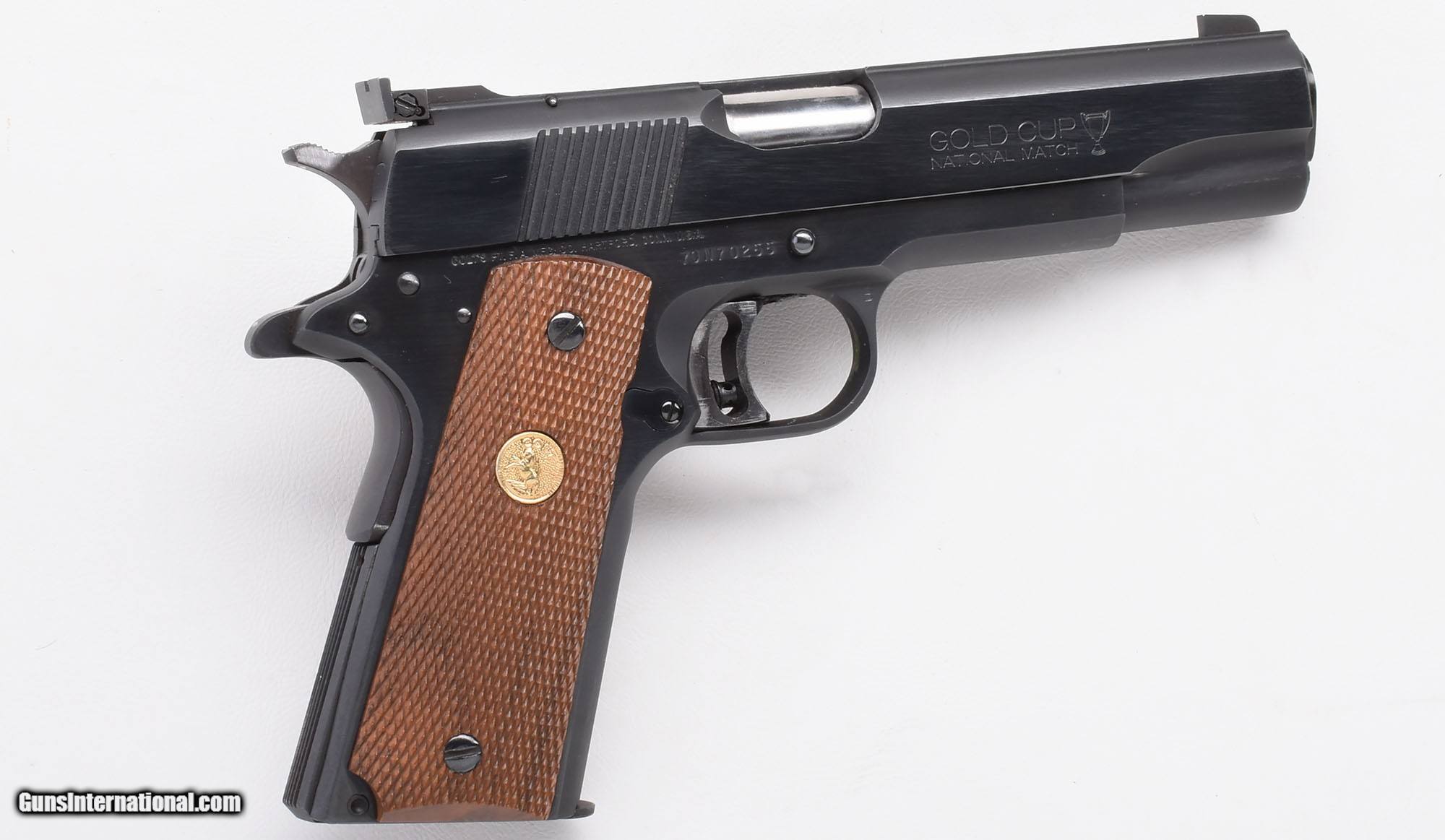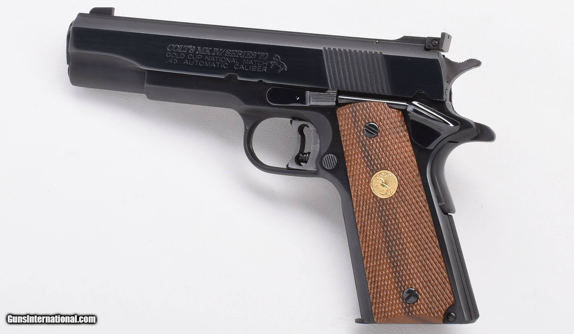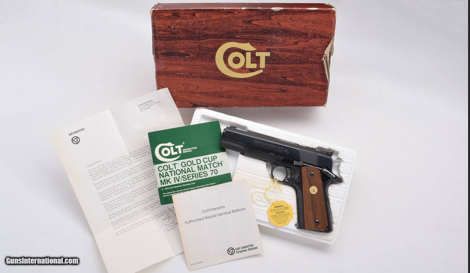 Description: High Condition pre-owned Colt Gold Cup National Match MKIV Series 70 in .45 Auto. Excellent bore presents sharp. Mechanisms are crisp and appear to be mechanically sound. Finish remains in very good order throughout exhibiting signs of light honest use that are commensurate with age and handling. Includes factory box, hang tag, inserts, and manual. SOLD Handgun Caliber: .45 ACP (.45 Auto) Manufacturer: COLT Model: Gold Cup National Match MKIV Caliber Info: .45 Auto Condition: High Condition Metal Condition: Excellent Bore Condition: Bright and Sharp Barrel Type: National Match Action: Single Action Auto Triggers: SAO - Wide Match Grade Adjustable Finish: High Polish Blue Weight: 38oz Sights: Fixed Front / Rear Adjustable Extras: Factory box, manual, hang tag, and inserts. Item Location: Buda, TX |