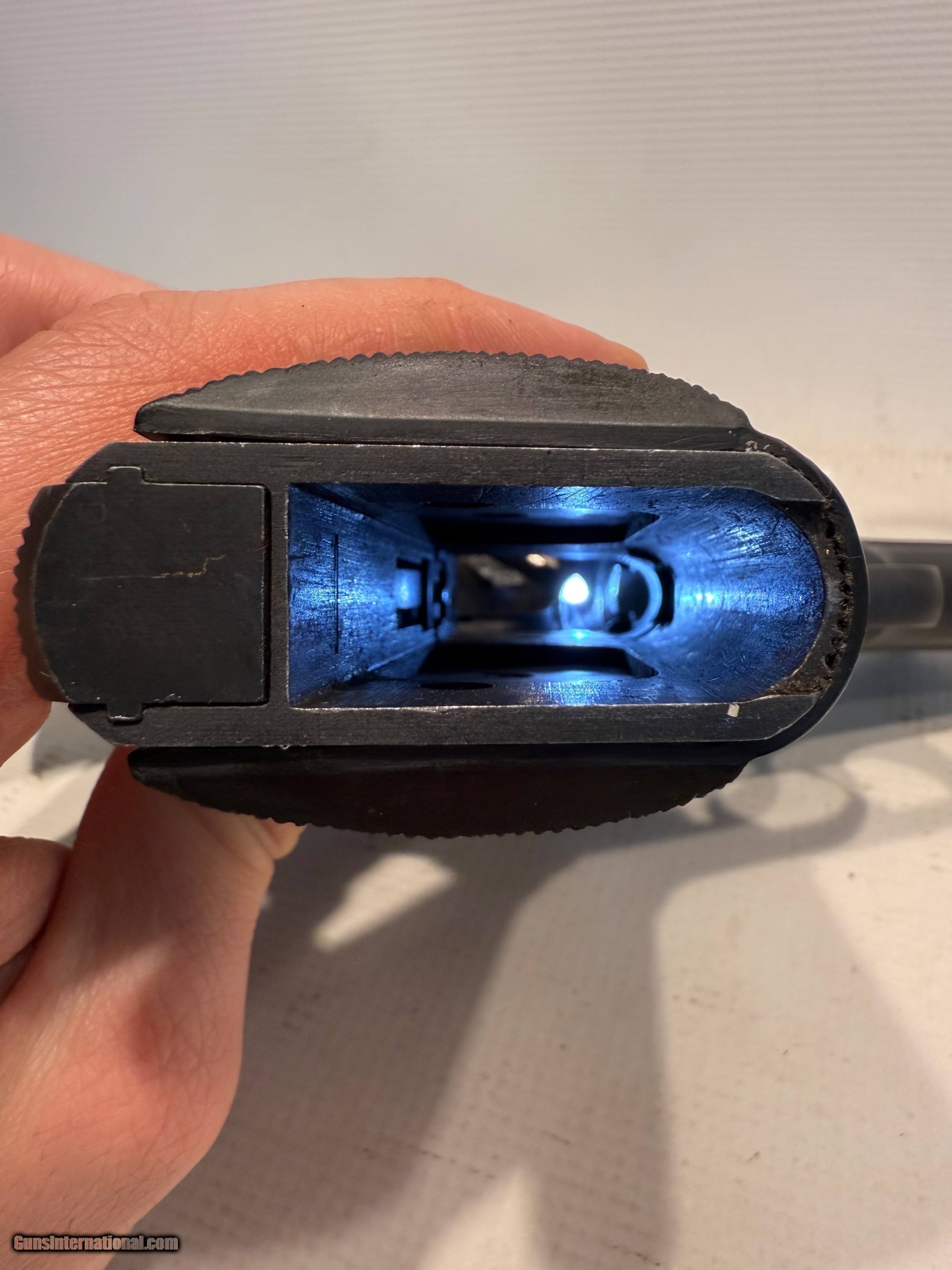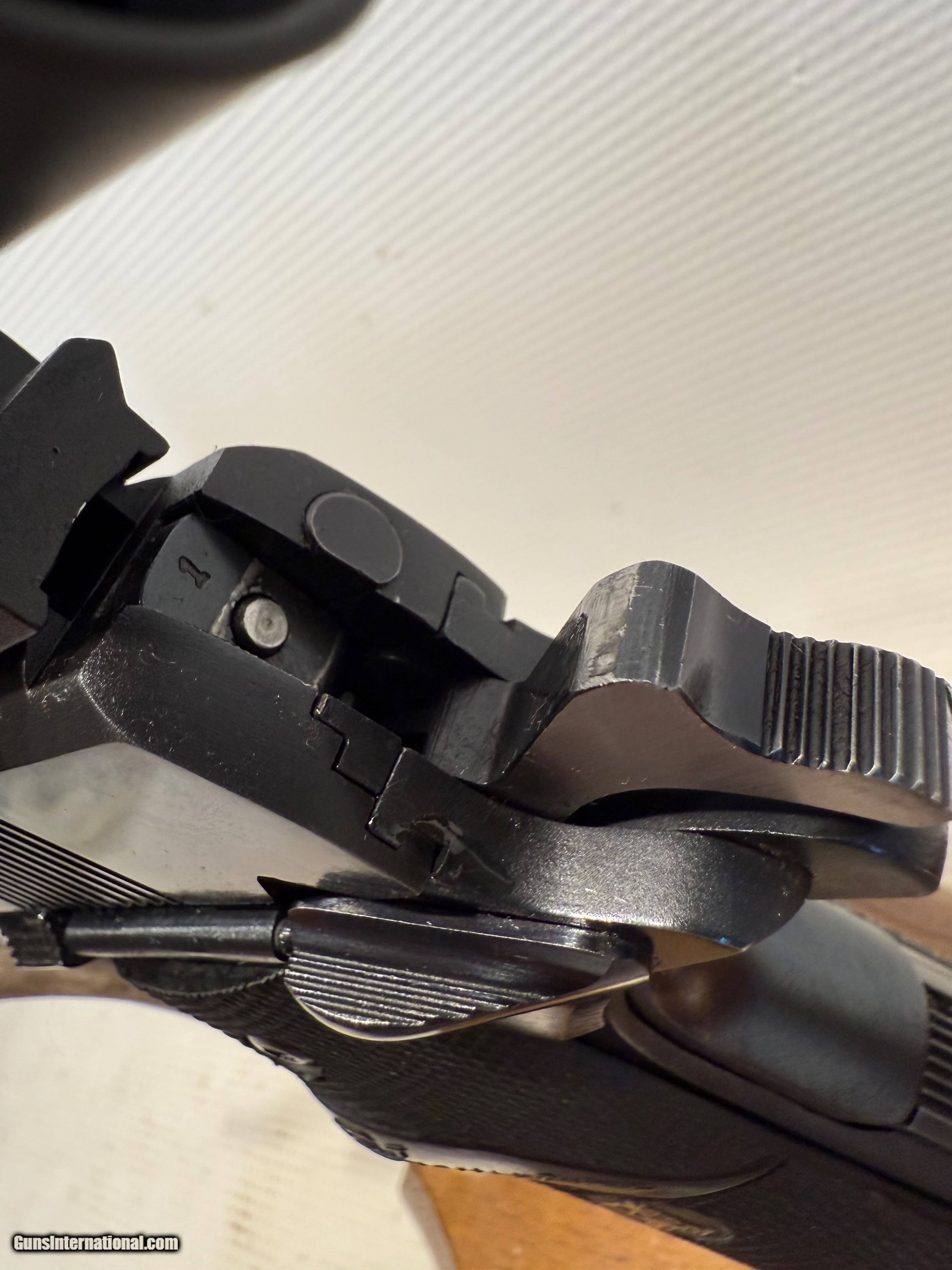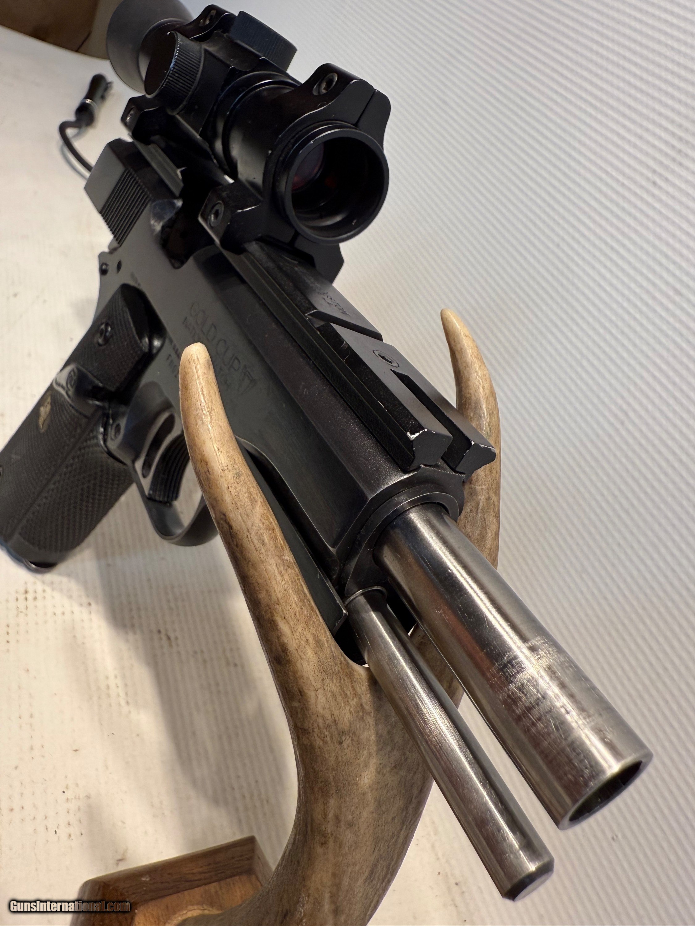 Description: Here we have a Colt Gold Cup Cup National Match Mark IV Series 80 chambered in 45 Auto. This gun features a 5" barrel, target trigger, a 7 round magazine, Pachmyer grips, a Clark Custom raised base and an Ultra Dot sight. This pistol is in good condition! The grips are in 90% + condition with a small imperfection. The frame and barrel have some wear marks by the muzzle and have been drilled and taped. They are in 85% +/- condition. The bore is good condition with nice rifling and is rated at 90% +/- condition. The Ultra Dot has a fresh battery and is in working condition. Overall, this gun is in 90% +/- condition! Please call with questions before purchasing. Handgun Caliber: .45 ACP (.45 Auto) Manufacturer: Colt Model: Gold Cup National Match Series 80 MK IV Serial Number: FN01730 Barrel Length: 5” Condition: 90% +/- Metal Condition: 85% +/- Bore Condition: 90% +/- Extras: Pachmyer grips and custom Target Grips Price: $1,100.00 Buy Now Contact Seller |