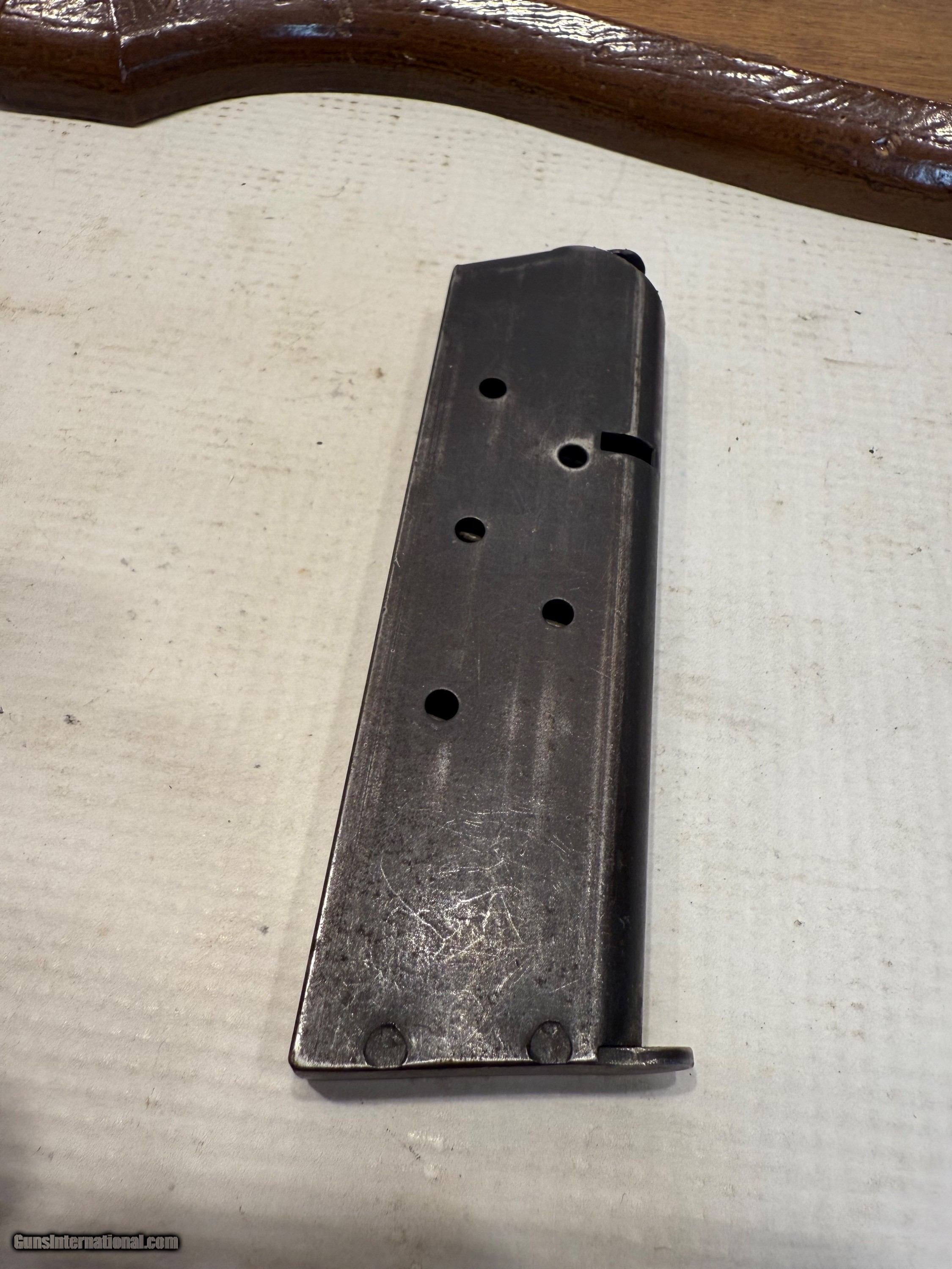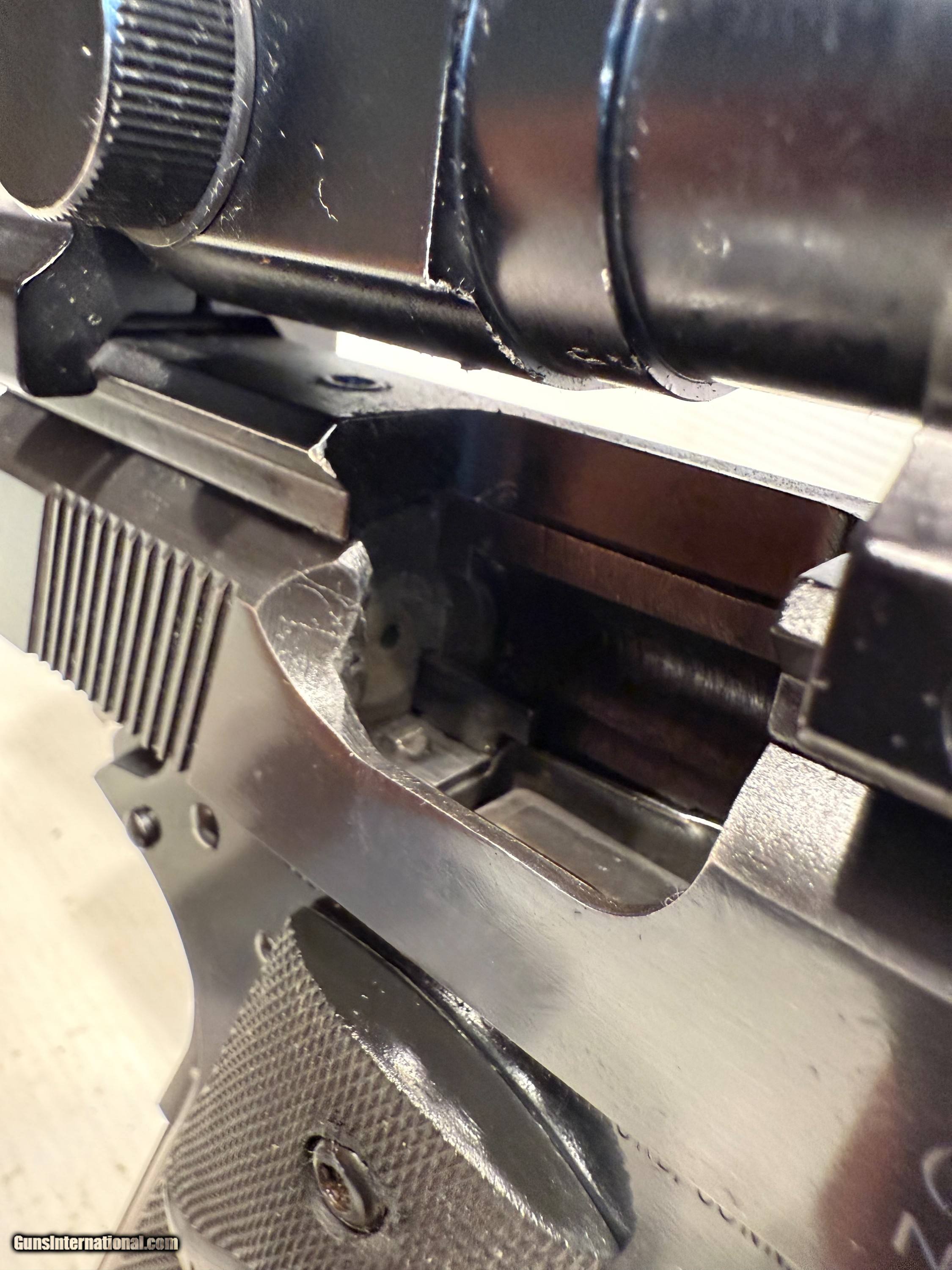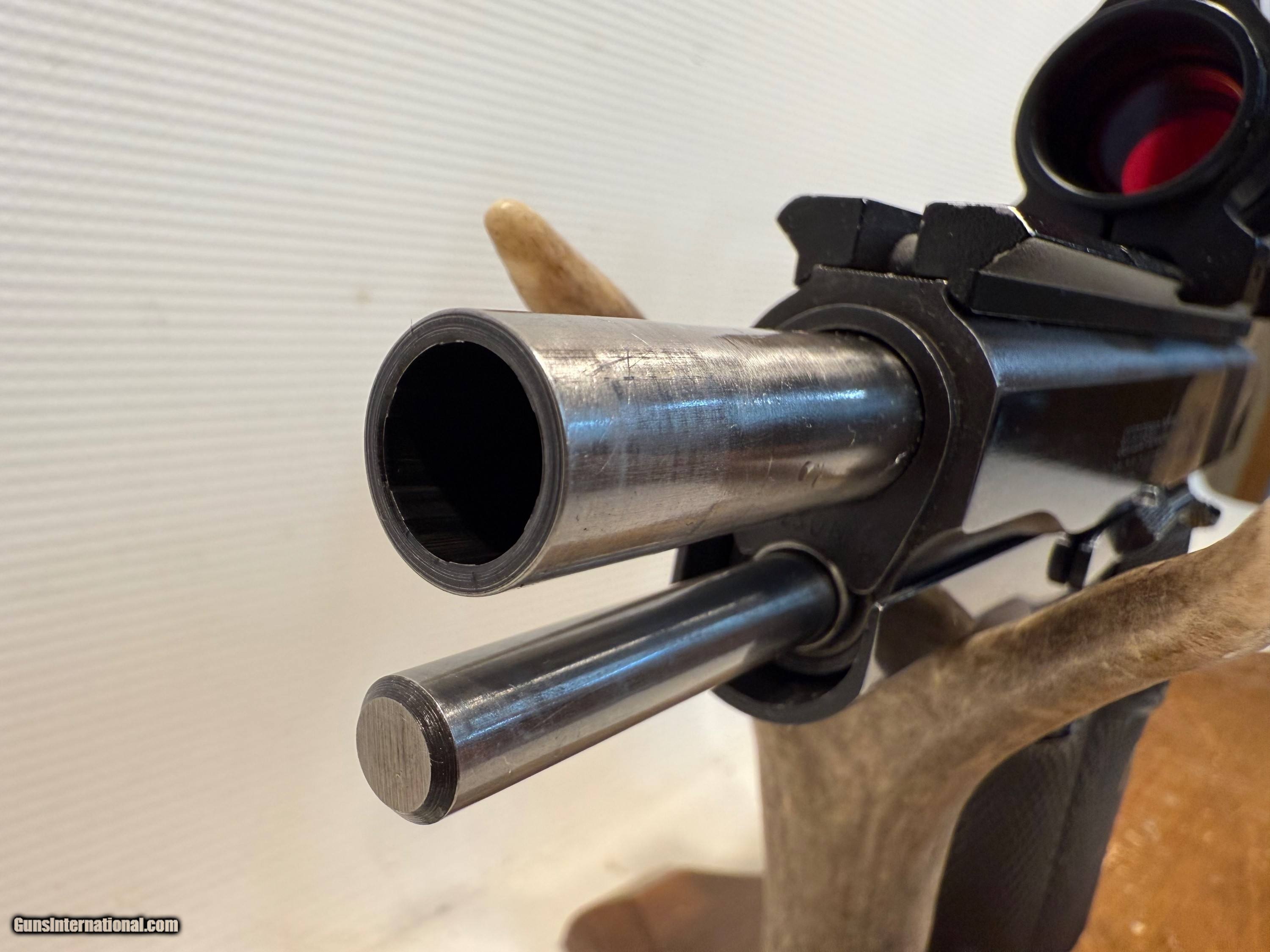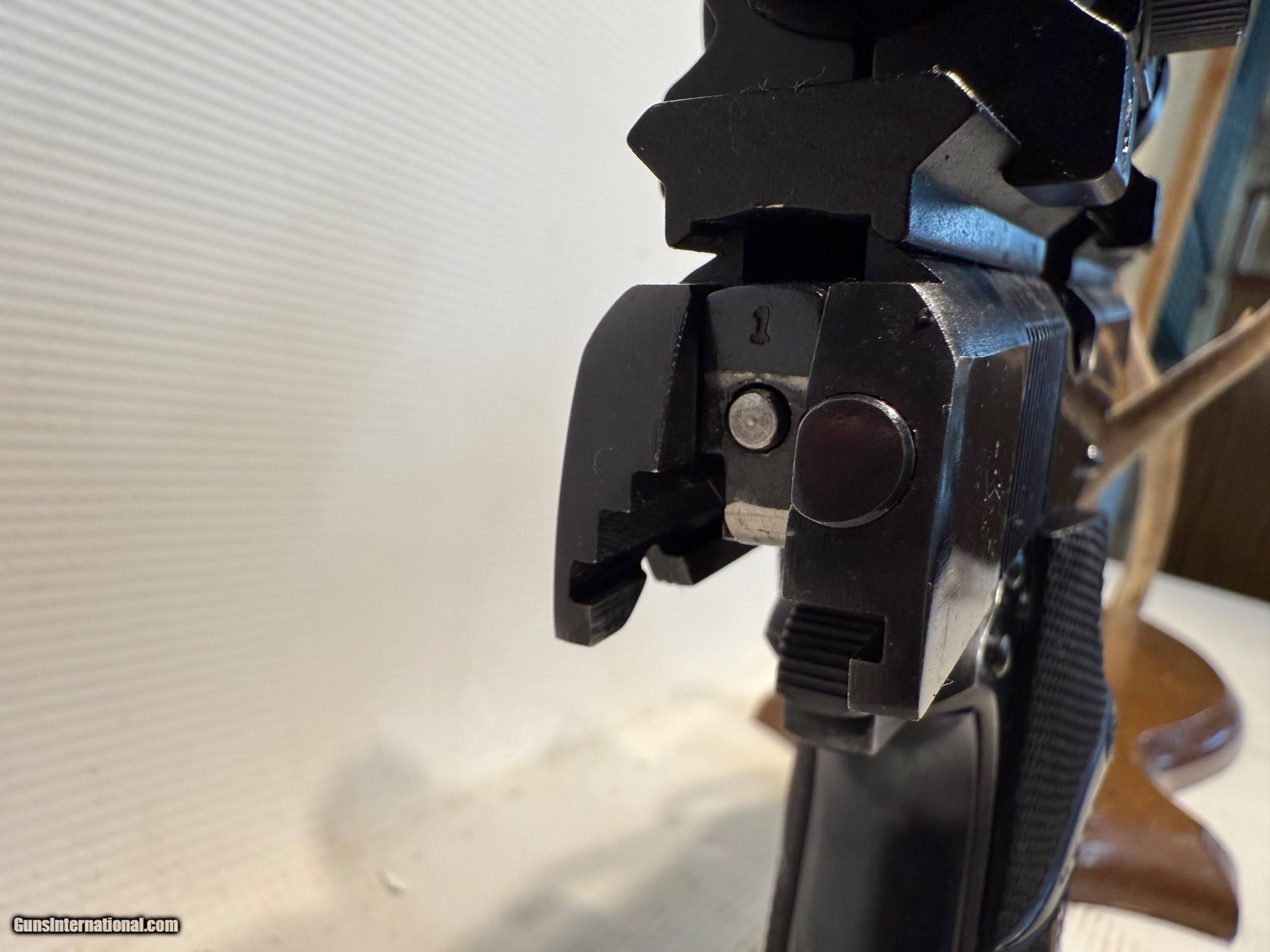 Description: Here we have a Colt Gold Cup Cup National Match Mark IV Series 80 chambered in 45 Auto. This gun features a 5" barrel, target trigger, a 7 round magazine, Pachmyer grips, a Clark Custom raised base and an Ultra Dot sight. This pistol is in good condition! The grips are in 90% + condition with a small imperfection. The frame and barrel have some wear marks by the muzzle and have been drilled and taped. They are in 85% +/- condition. The bore is good condition with nice rifling and is rated at 90% +/- condition. The Ultra Dot has a fresh battery and is in working condition. Overall, this gun is in 90% +/- condition! Please call with questions before purchasing. Handgun Caliber: .45 ACP (.45 Auto) Manufacturer: Colt Model: Gold Cup National Match Series 80 MK IV Serial Number: FN01730 Barrel Length: 5” Condition: 90% +/- Metal Condition: 85% +/- Bore Condition: 90% +/- Extras: Pachmyer grips and custom Target Grips Price: $1,100.00 Buy Now Contact Seller |