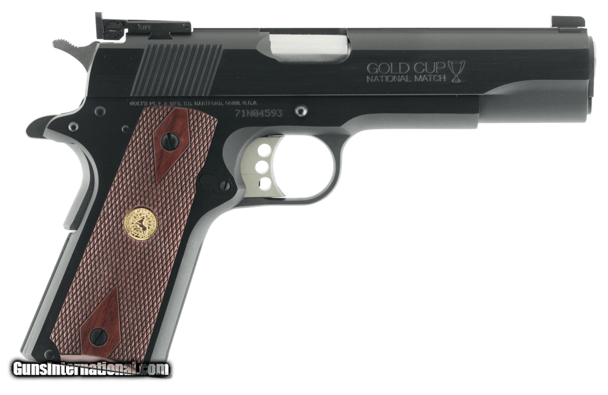 Description: Guns Listing ID: 49577 First introduced in the 1950s and modeled after the original M1911 the Colt Gold Cup is a competition class semi-automatic handgun chambered in 9mm and 45 ACP. Features include an adjustable wide trigger a National Match barrel and a lowered and flared ejection port as well as target post front and fully adjustable Bomar rear sights. The Gold Cup also employs a round top slide and wrap around rubber stocks. Details The Colt Gold Cup is known as the finest shooting semi-automatic in the world and is the standard for competitive guns. The first Colt Gold Cup pistol was introduced in the late 1950s to give competitive shooters a gun to take directly from the dealers showcase to the firing line. Colt Gold Cup pistols have been used to compete in local club matches through the National Matches at Camp Perry. It features an Adjustable Wide Trigger National Match Barrel Adjustable Target Sights and many other refinements as standard. - Features - Standard Safety Lock - Wide Target Trigger - Lowered and Flared Ejection Port - National Match Barrel - Round Top Slide - Fully Adjustable Bomar Style Rear Sight - Target Post Front Sight SOLD Manufacturer: COLT Model: GOLD CUP NATIONAL MATCH Caliber Info: .45 ACP Condition: new Barrels: 5" barrel |