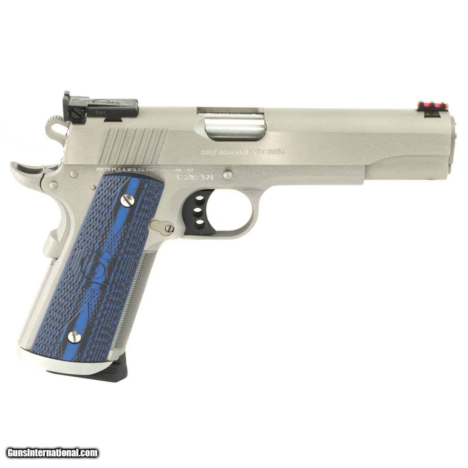 Description: NEW IN STOCK olt's Manufacturing Gold Cup Trophy, 1911, Semi-automatic, Metal Frame Pistol, Full Size, 45ACP, 5" Barrel, Steel, Stainless Finish, G10 Checkered Blue Grips with Scallop, Fiber Optic Front, Bomar Style Rear Sights, 8 Rounds, 1 Magazine O5070XE
