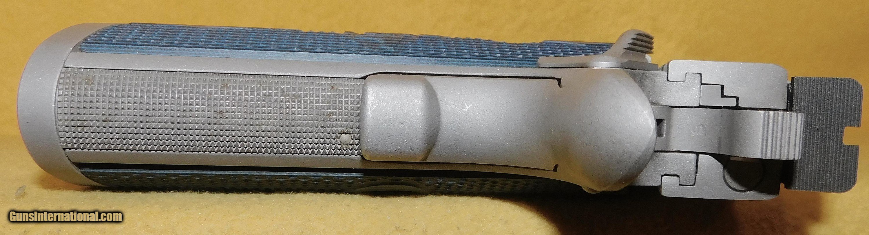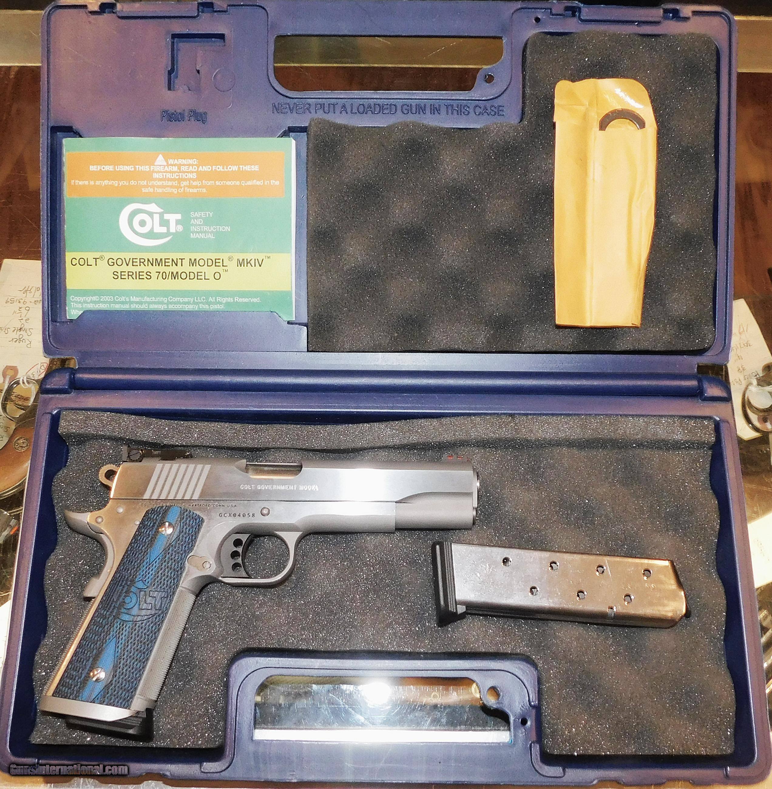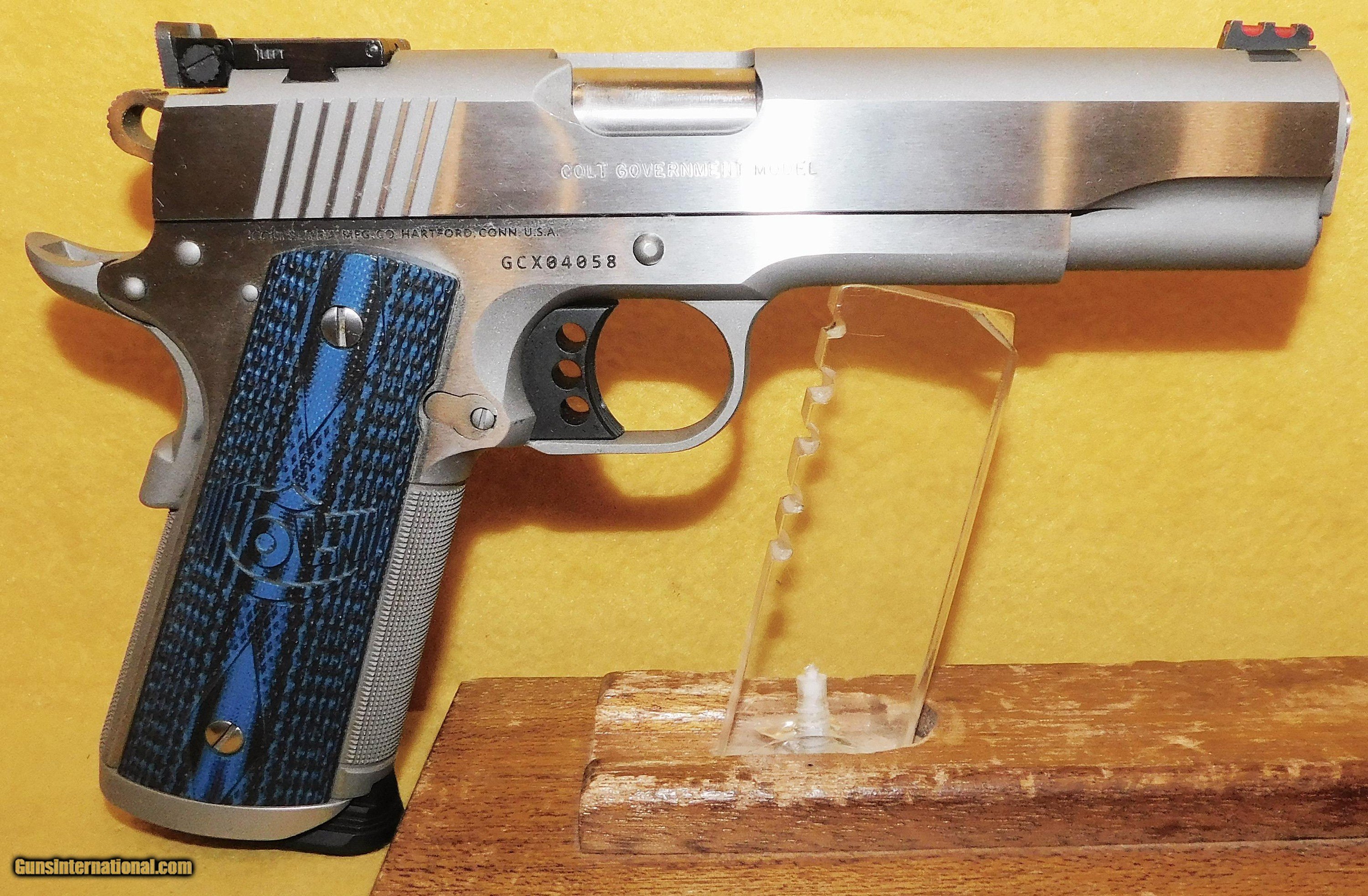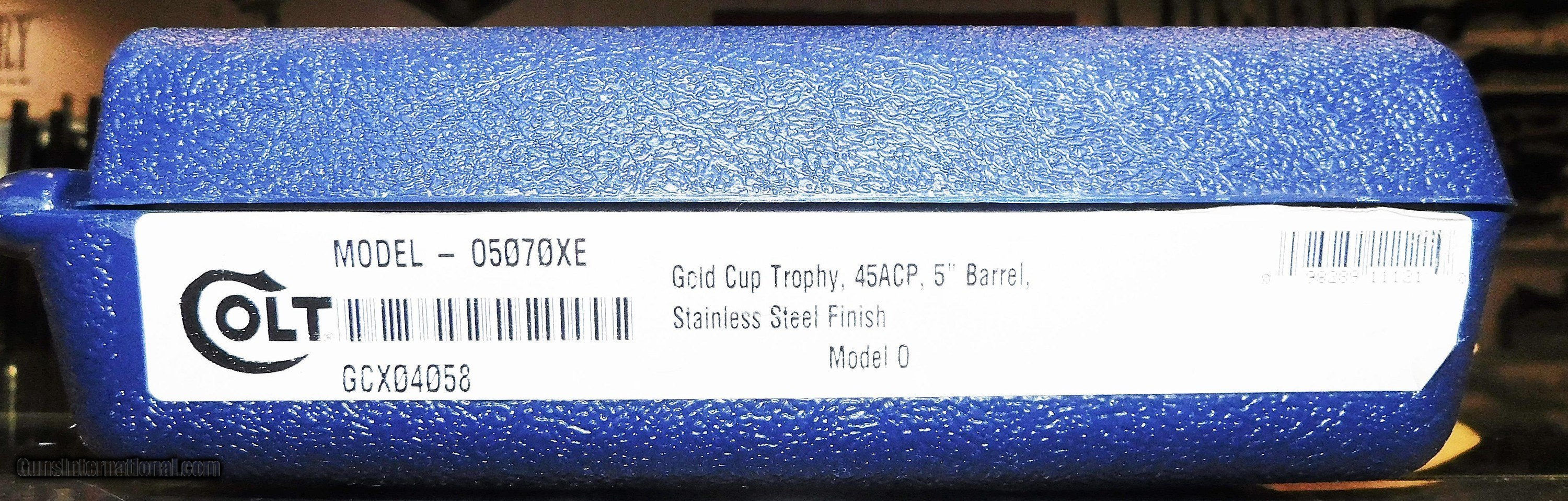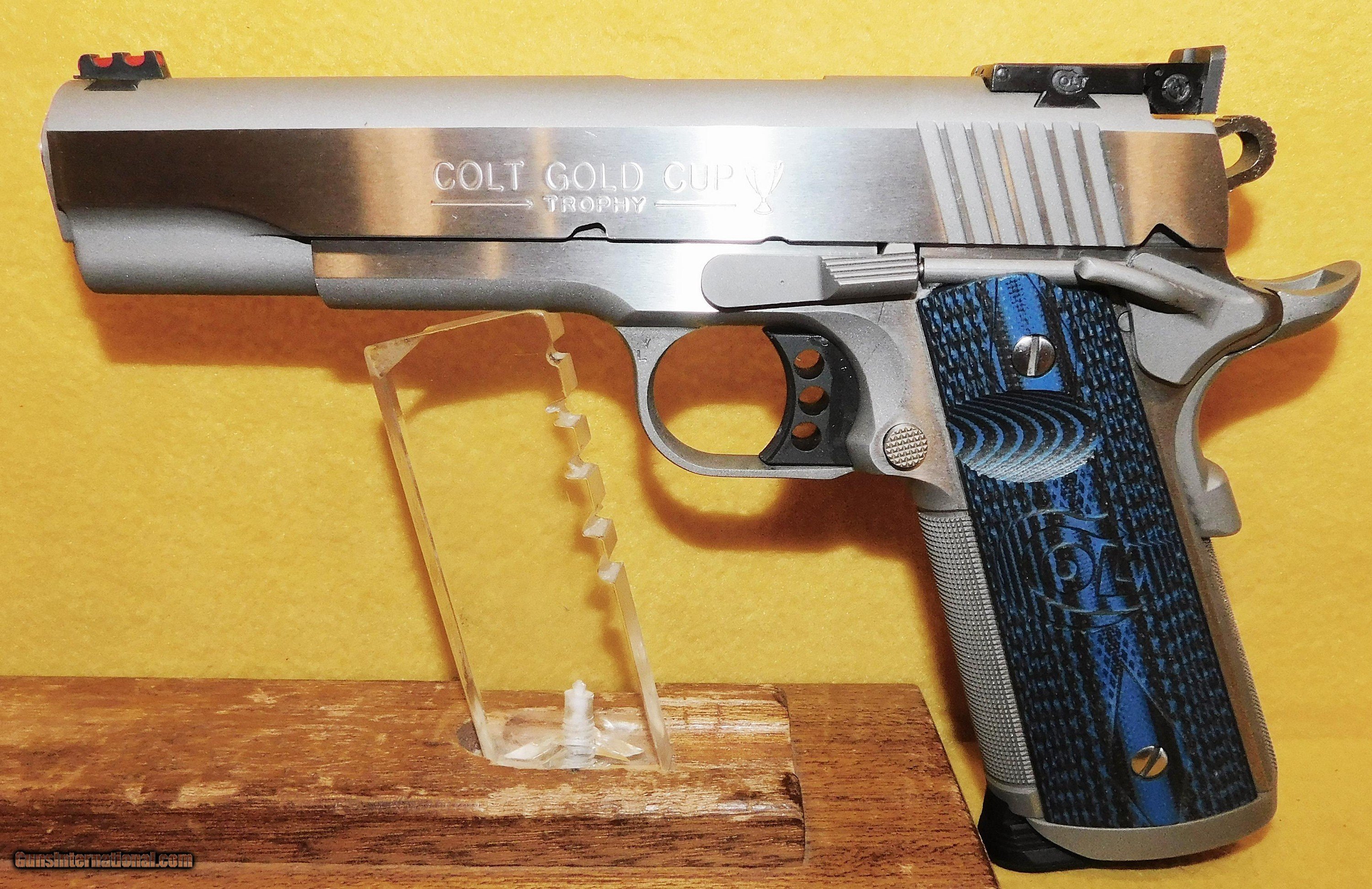 Description: COLT GOV MODEL 1911 GOLD CUP TROPHY IN .45 ACP CAL., WITH 5" BARREL. COLOR STAINLESS STEEL. CONDITION 98%+. SERIAL NUMBER GCX04058. COLT MODEL 1911 GOVERNMENT MODEL COLD CUP TROPHY IN .45 ACP CALIBER, MIRROR BORE, CHECKERED BLUE TARGET PANELS EXCELLENT, ADJUSTABLE REAR TARGET SIGHT WITH RED FIBER OPTIC FRONT BLADE, COMES WITH TWO FACTORY MAGAZINES, BLUE HARD CASE WITH PAPERS, 98%+ OVERALL CONDITION, OUR STOCK # D6997 SOLD |