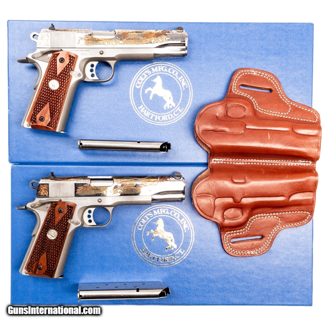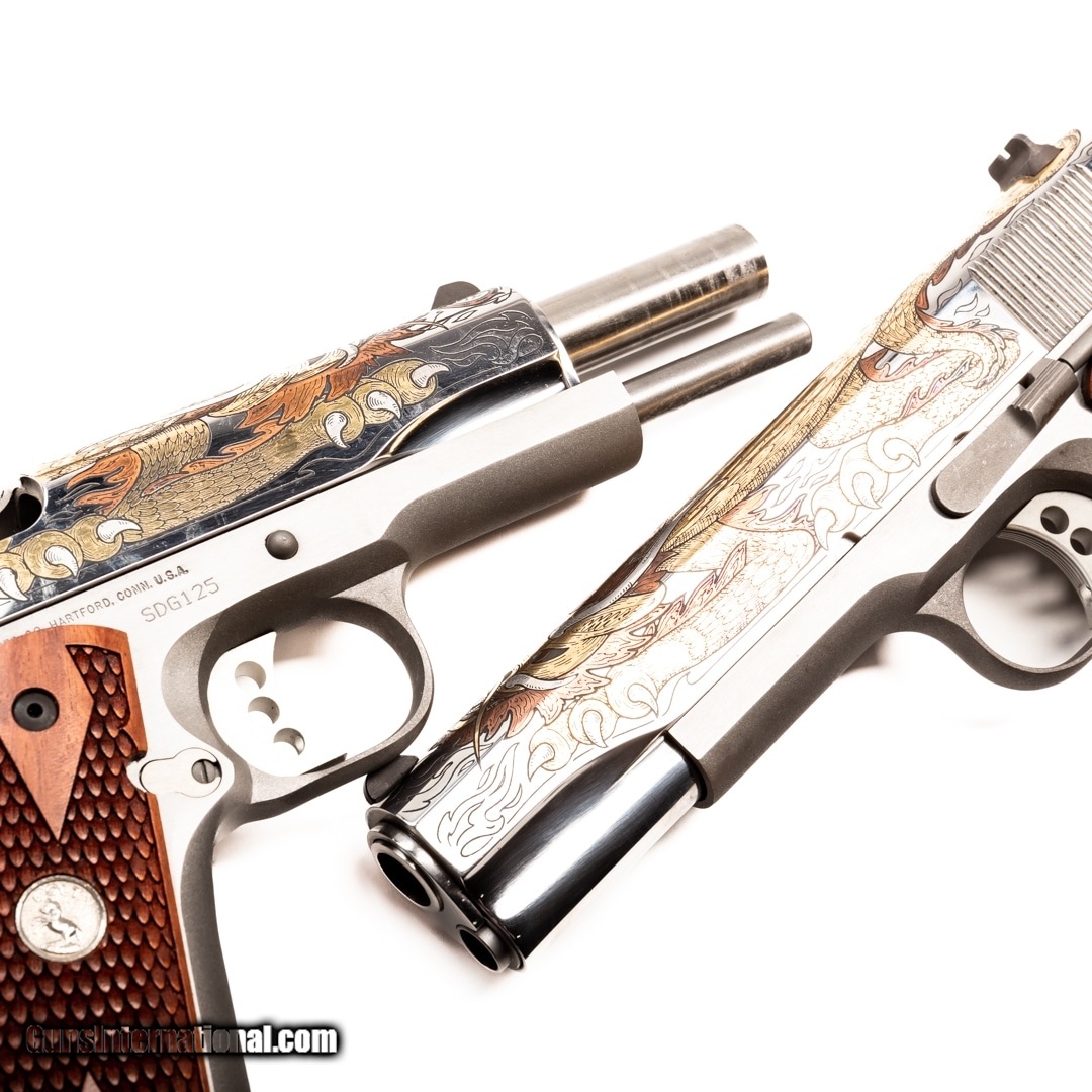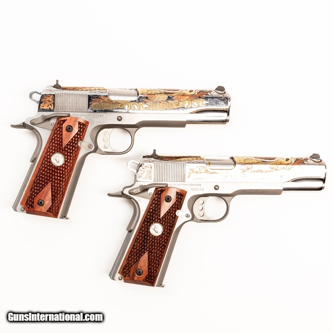 Description: Guns Listing ID: 829018 The Colt 1911 Government Model is a semi-auto handgun chambered in 45 ACP and a direct descendent of the M1911. The 1911 is arguably the most iconic firearm design of John Moses Browning, while also holding a strong argument for being the most iconic firearm design in United States history. The action and design would be the footprint for the vast majority of semi-auto pistols that are still in production today. The 1911 served as the standard issue handgun for the U.S. Armed Forces from 1911 until 1985, it served in countless other militaries and police forces across the globe, and it also still serves with Special Operation units even to this day. Colt 1911s are held in a special regard as they were the original company to field the design. Colt’s quality and production capabilities propelled them to a juggernaut status throughout the 20th century. This set of Colt 1911 handguns are custom engraved with the image of dragons on the slide, while having a beautiful nickel finish, wood grips with aggressive texturing, and Gold inlay into the artwork. The popular western image of a dragon as winged, four-legged, and capable of breathing fire is an invention of the High Middle Ages. In western cultures, dragons are portrayed as monsters to be tamed or overcome, usually by saints or culture heroes. In China, the word “dragon” has also come to be associated with good fortune. The emperor of China was the only one permitted to have dragons on his house, clothing, or personal articles. In Mexico, a feathered serpent deity has been worshipped by many different groups. Mexican winged serpent motifs are frequent. Colt decided to take this timeless and ferocious image and pair it a firearm that has a timeless and ferocious reputation. These handguns are a set of sequential serial numbers (SDG125-SDG126) and this purchase includes a dual 1911 holster, the original boxes with manuals, and four 7-round magazines. Get the best bang for your buck when you get a Certified Used Firearm . When you see the Certified Used stamp on any of our firearms, you can be confident that you’re getting exactly what you want – a gun only in very good to excellent condition and held to the highest quality standard. All Certified Used Guns come with a ‘no questions asked’ return policy . PLUS, ALL CERTIFIED USED GUNS SHIP FREE! SOLD Manufacturer: COLT Model: GOV‚‚T Caliber Info: .45 ACP Condition: Used - Certified Barrels: 5 BARREL Finish: NICKEL |
