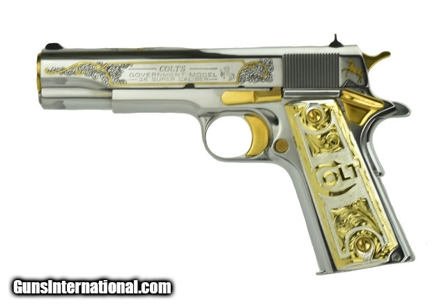 Description: Colt Government .38 Super caliber pistol. Deluxe gold Stallion model with gold decorations and fancy grips. With box.