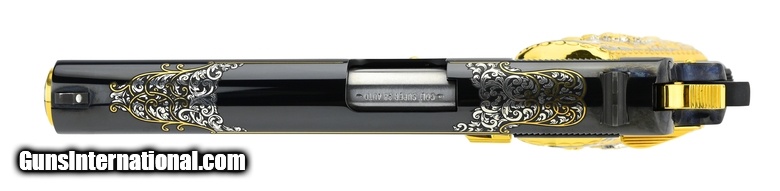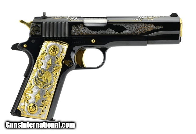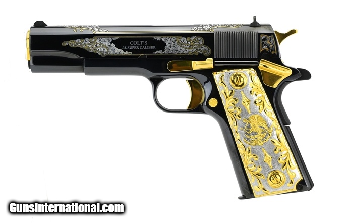 Description: Colt Government .38 Super caliber pistol. Silver and Gold special edition with fancy grips. Excellent condition with box.