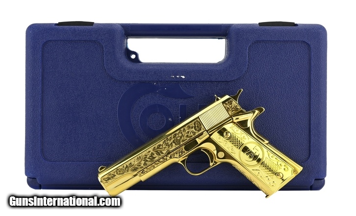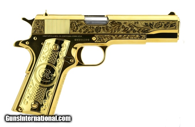 Description: Colt Government .38 Super caliber pistol. Custom engraved and gold plated with fancy grips. A beauty! With box.