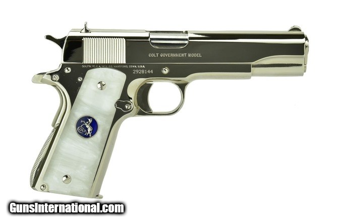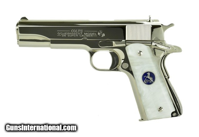 Description: Colt Government .38 Super caliber pistol. Customized with bright nickel finish and fancy grips. New.