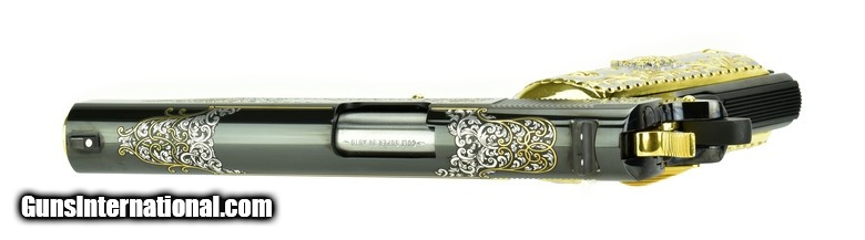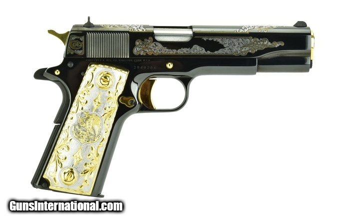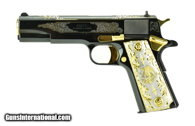 Description: Colt Government .38 Super caliber pistol. Polished blue with gold and silver engraving and fancy grips. New.