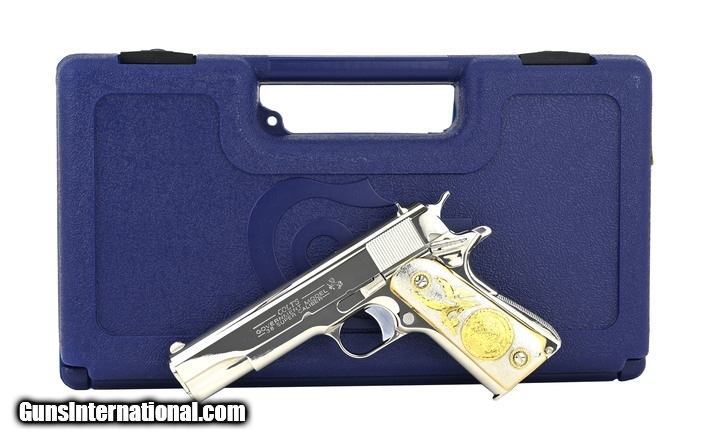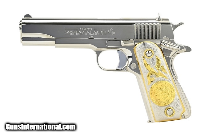 Description: Colt Government .38 Super caliber pistol. Customized with bright nickel finish and fancy grips. New.