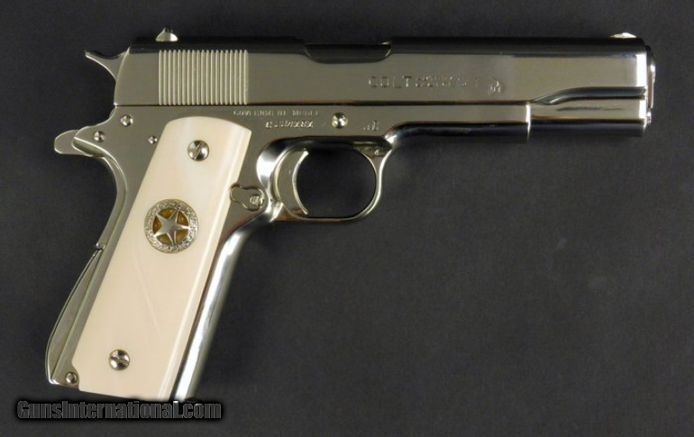 Colt Government .45 ACP caliber pistol. Pre-War model with custom nickel finish and fancy grips. Some of the markings show buffing, overall a good looking piece.