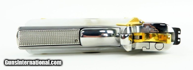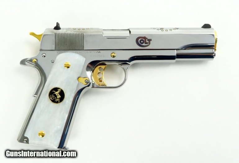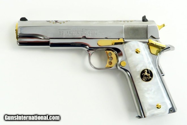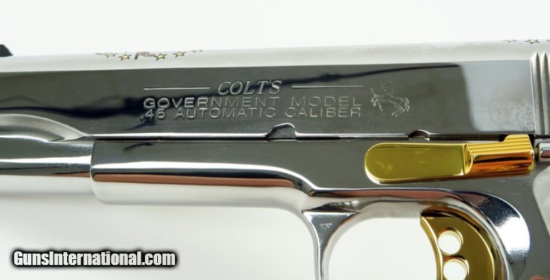 Colt Government .45 ACP caliber pistol. Gold Stallion special edition with bright stainless finish, gold etched decorations, and gold trim. A fancy piece, ready for the barbeque.