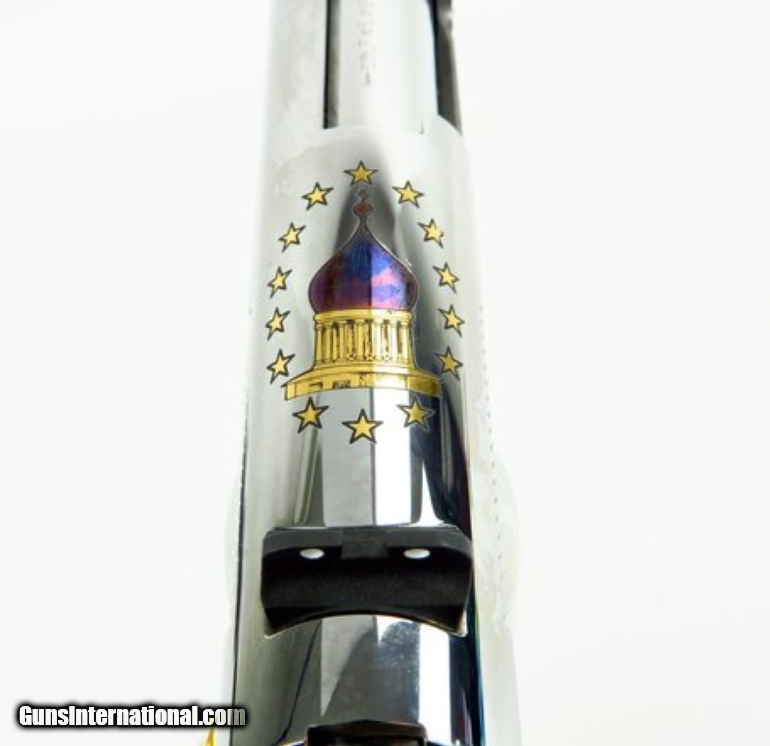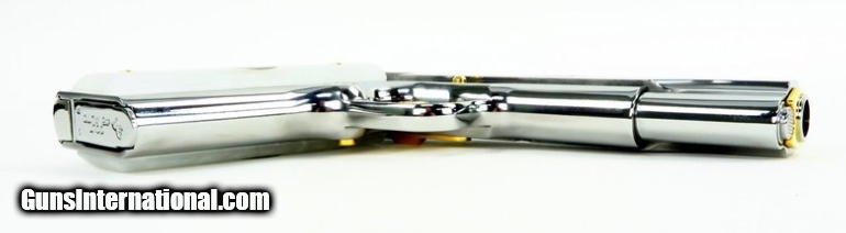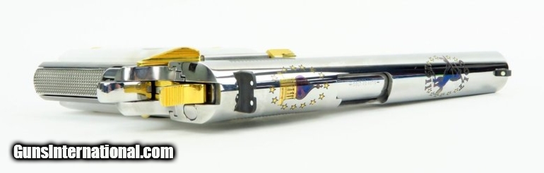 Description: Colt Government .45 ACP caliber pistol. Gold Stallion special edition with bright stainless finish, gold etched decorations, and gold trim. A fancy piece, ready for the barbeque. SOLD |