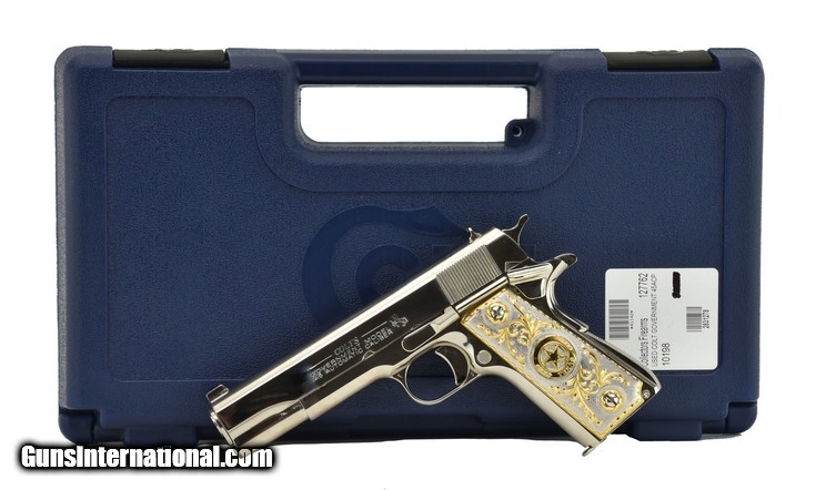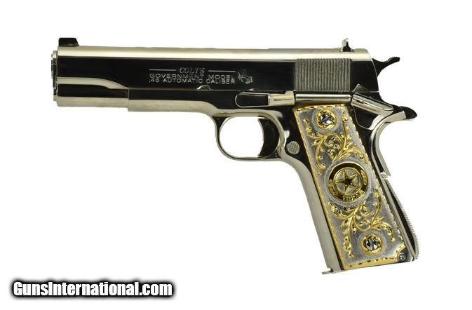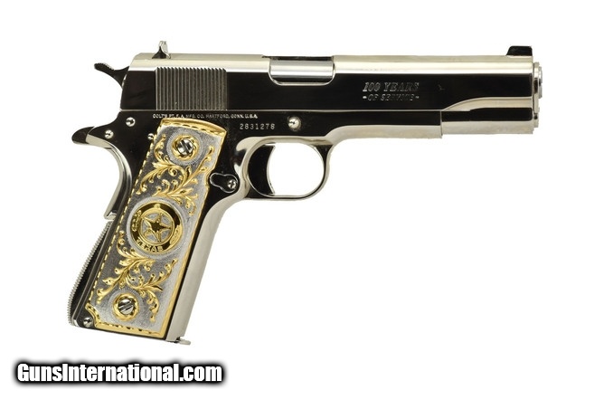 Colt Government .45 ACP caliber pistol. “100 years of service” model made in 2011. Has custom bright nickel finish and fancy Texas grips. Excellent condition with box. A great barbeque gun.