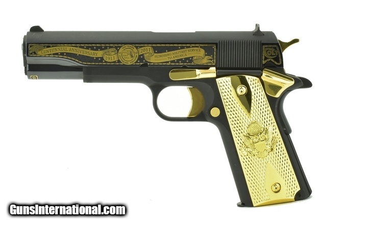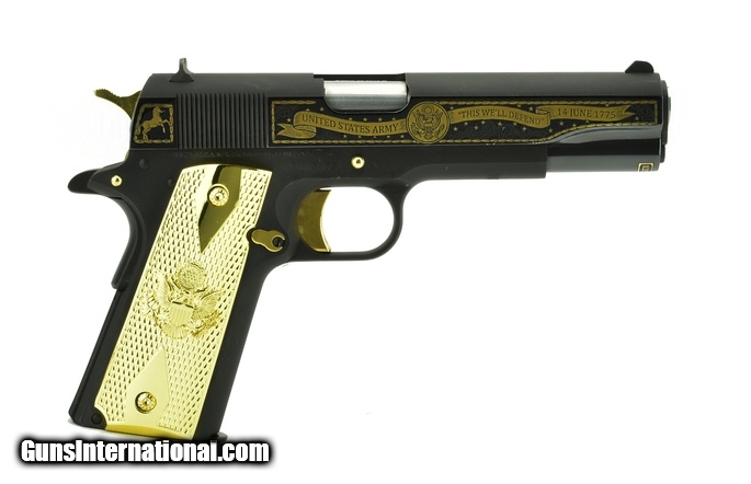 Description: Colt Government .45 ACP caliber pistol. Centennial military service special edition with gold decorations.