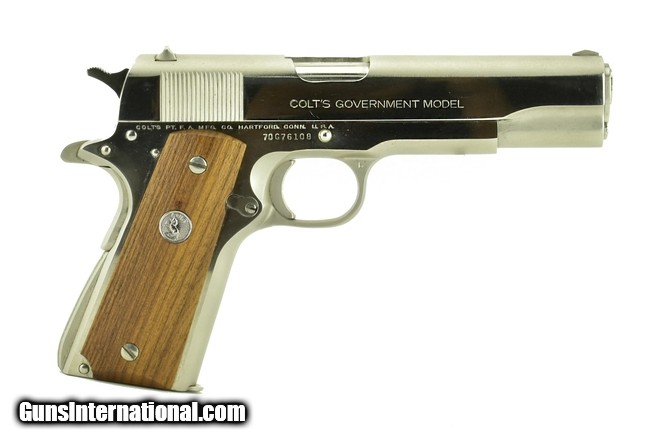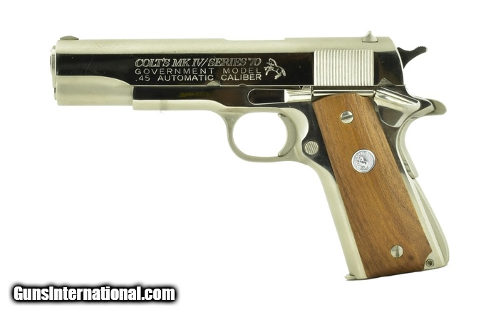Description: Colt Government .45 ACP caliber pistol. Original nickel plated series 70 made in 1975. Excellent condition with very light wear.