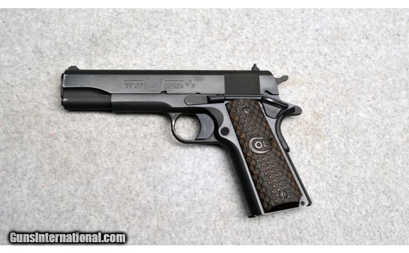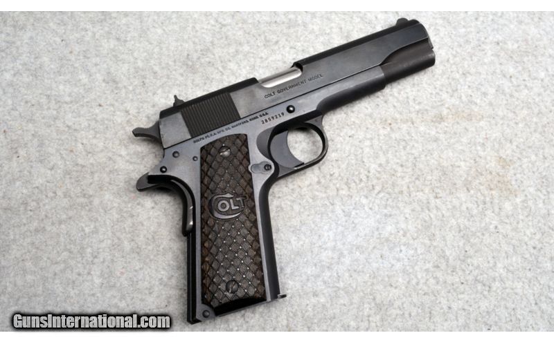 Description: Colt Government Model pistol .45 ACP. Good condition, with one mag. 2013 production commercial Colt 1911 pistol, but still a good choice for target practice. SOLD Manufacturer: Sources indicate 2013 production. Caliber Info: .45 ACP Metal Condition: Good, shows some finish wear from normal use. Wood Condition: Grips are in excellent condition. Bore Condition: Like New, shiny. Barrels: 5 Inch Triggers: Single Action Only. Stock: Checkered Wood Grips with Colt logo. Weight: 40 oz. Sights: 3 Dot sights. Extras: There are no extras implied with the sale of this pistol. Item Location: Hazelwood, MO |