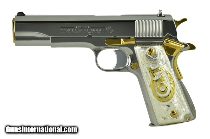 Description: Colt Government Custom .38 Super caliber pistol. Custom bright polished stainless steel with gold parts and fancy grips. A beautiful piece, in excellent condition.