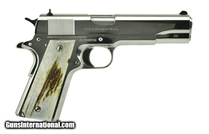 Colt Government Custom 38 Super Caliber Pistol. Bright Stainless model with stag grips. Excellent condition.