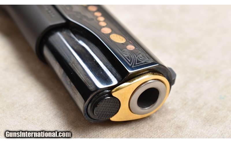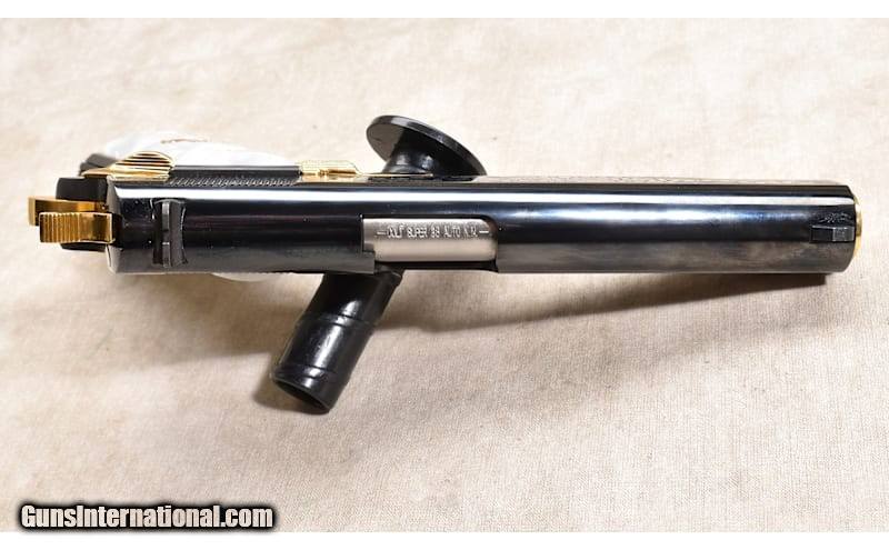 Description: Highly decorated Government Model Colt, chambered in .38 Super Auto, and ready for formal dinners with "The Family." This limited edition pistol, 146 of 300, features Mother of Pearl grips, and is engraved with Acantus scrollwork with a gold-filled Rosary beads draped though the slide. Very pretty. and Like New in the Box. .38 Super Chambers: 8 rounds Metal Condition: LNIB. Wood Condition: LNIB. Bore Condition: LNIB. Barrels: 5 inches Triggers: Factory single action trigger Butt Pad: Mother of pearl with gold-plate screws and Colt logo Weight: 40 oz Sights: Fixed post and notch. Item Location: Rogers Price: $3,199.99 Contact Seller |