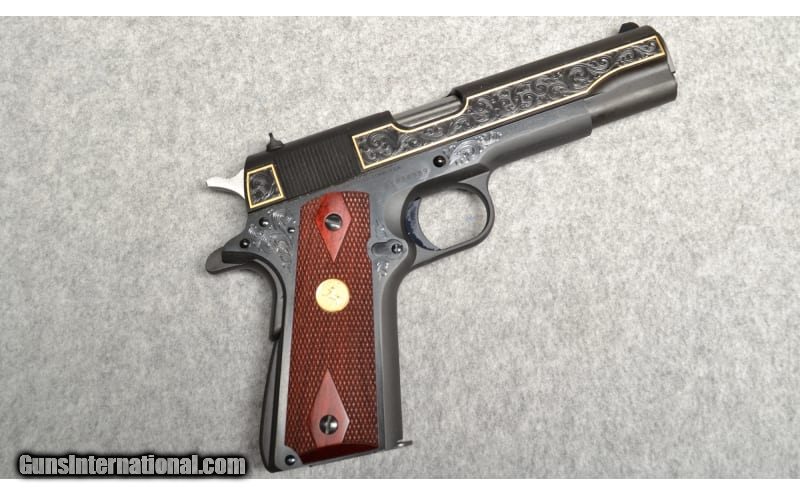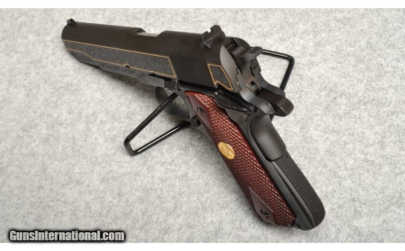Description: This new in box Colt Government Model 1911 has armory style cut engraving with gold bordered slide. A tribute to the commercial Government Model pistols of the past, the 1911 Classic features the Series 70 firing system and roll marks, national match barrel, staked on front sights, and spurred hammer. Chambered in the revered .45 ACP and blued, this classic yet simple 1911 design is very easy on the eyes and would look great in a shadow box to display on a desk or simply to add some decor to your man cave or mantle. .45 Auto SOLD Chambers: .45 Auto Metal Condition: New Wood Condition: New Bore Condition: New Barrels: 5" National Match Triggers: Factory Fore End: Blued Butt Pad: Steel Frame / Double Diamond Rosewood Grips Weight: 2.5 lbs Sights: Blacked out rear/ front blade Item Location: Columbus, OH |