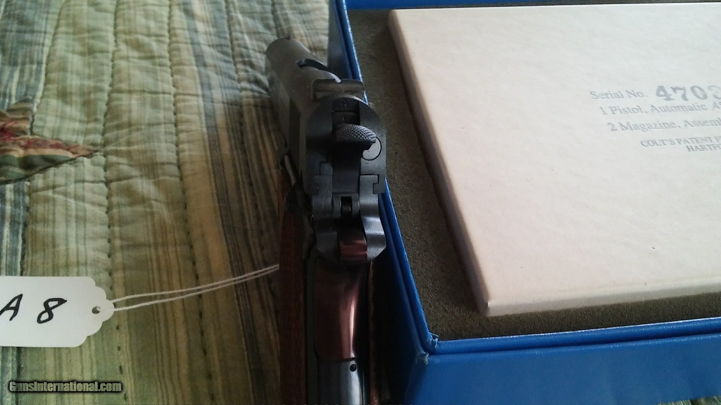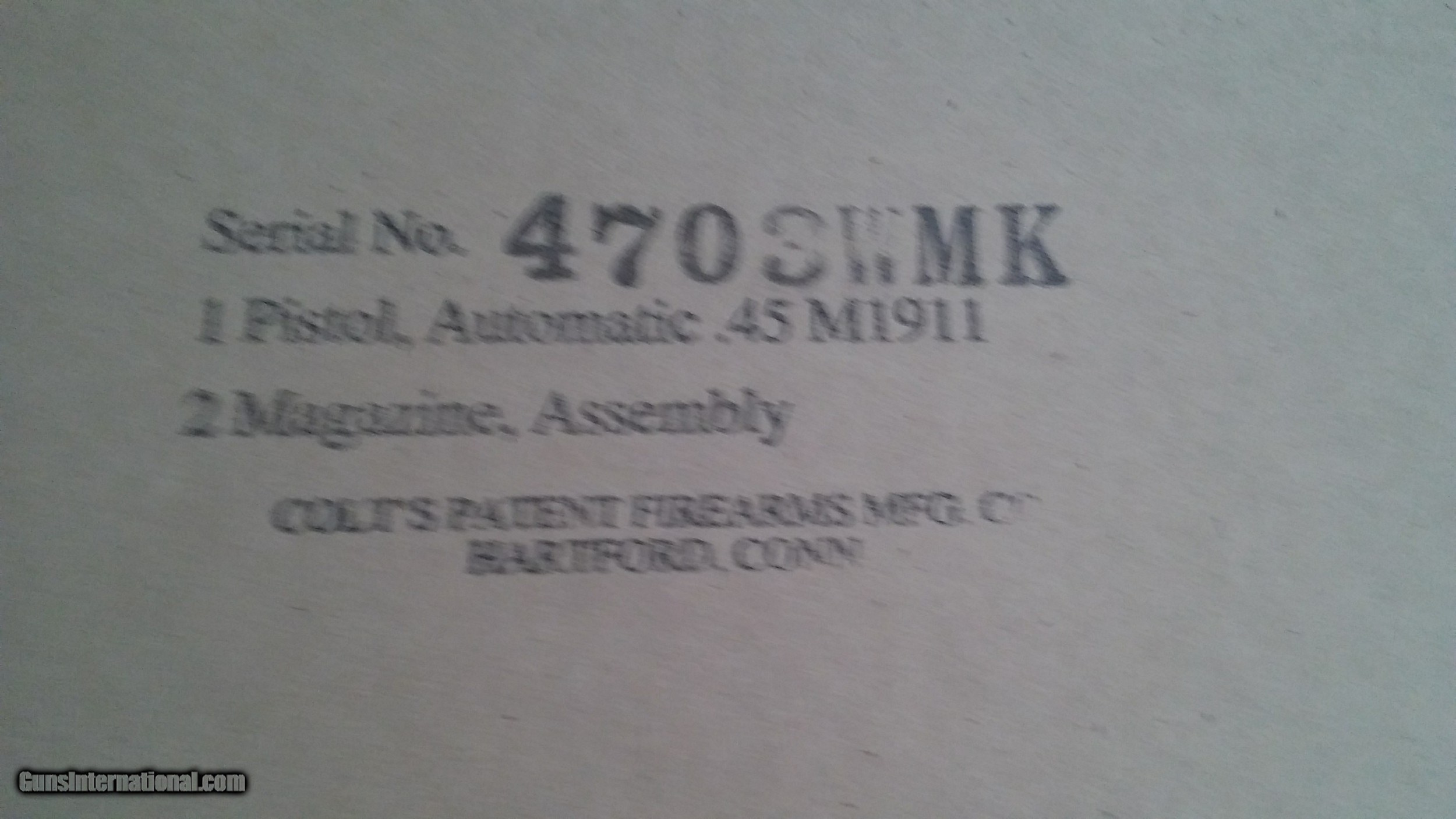 Description: Colt Government model 1911 45 ACP in original issue box new unfired with extra magazines SOLD Manufacturer: colt Model: 1911 Serial Number: 4703wmk Caliber Info: 45acp Condition: new unfired Item Location: North Georgia |
