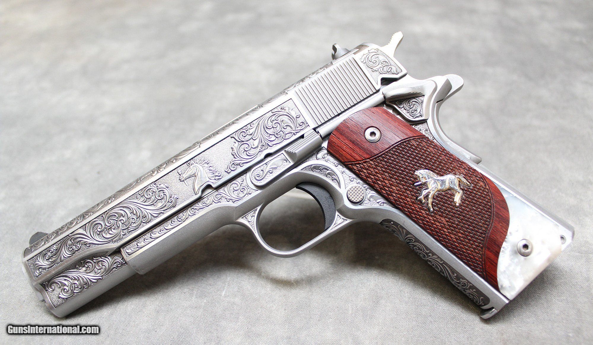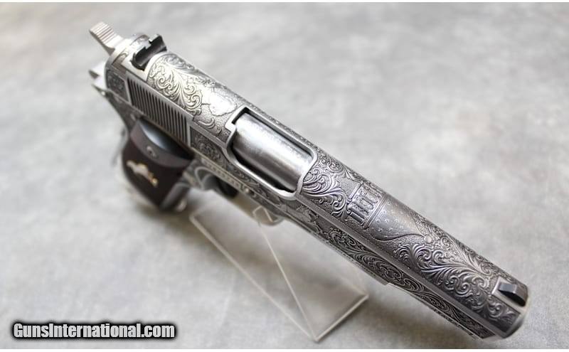 Description: This firearm is Altamont engraved with pearl style inlays in the grips. .38 Super SOLD Metal Condition: EXCELLENT Wood Condition: EXCELLENT Bore Condition: EXCELLENT Barrels: FIVE INCH STAINLESS STEEL BARREL Weight: 2 lbs 11 ozs Item Location: Oklahoma City, OK |