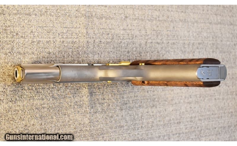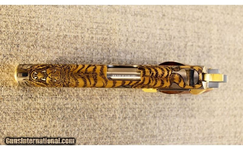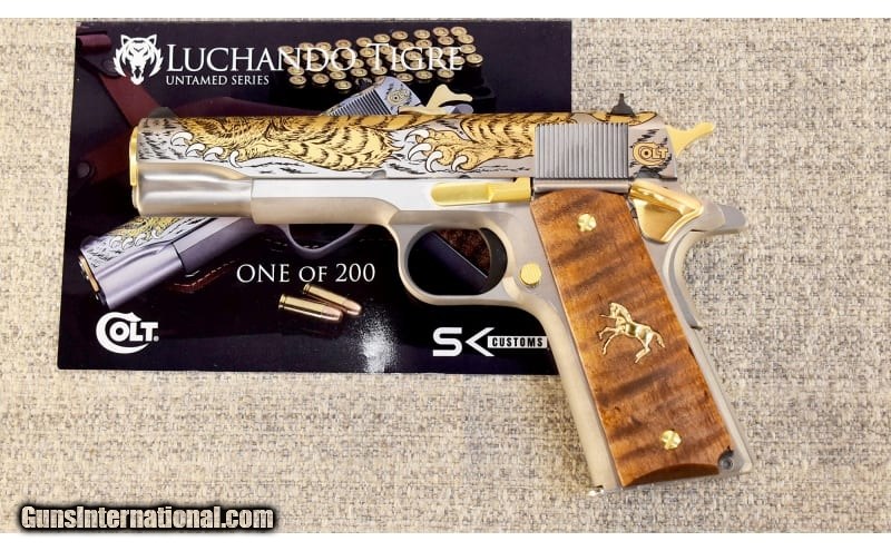 Description: This is a factory direct limited edition Colt Government model in .38 Super, the Luchando Tigre, number 155 of 200, part of the Untamed Series by SK Customs featuring 24k gold tiger with black-filled stripes and silver plated eyes, teeth and claws .38 Super SOLD Metal Condition: As new in box Wood Condition: As new in box Bore Condition: Clean with bright lands Barrels: 5 Triggers: SA Butt Pad: Tiger maple grips Weight: 2 Lbs. 6 Oz. Sights: "Blade front, U-notch rear Item Location: Glendale, AZ |