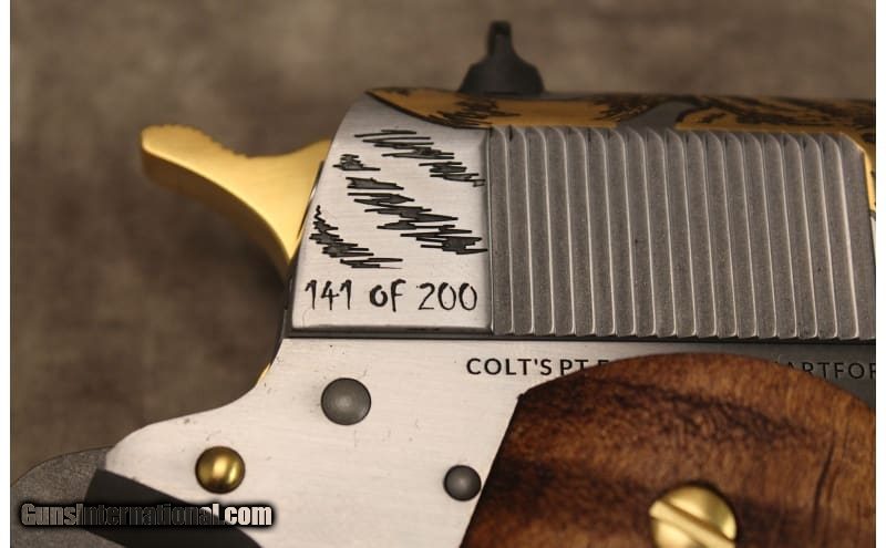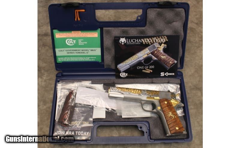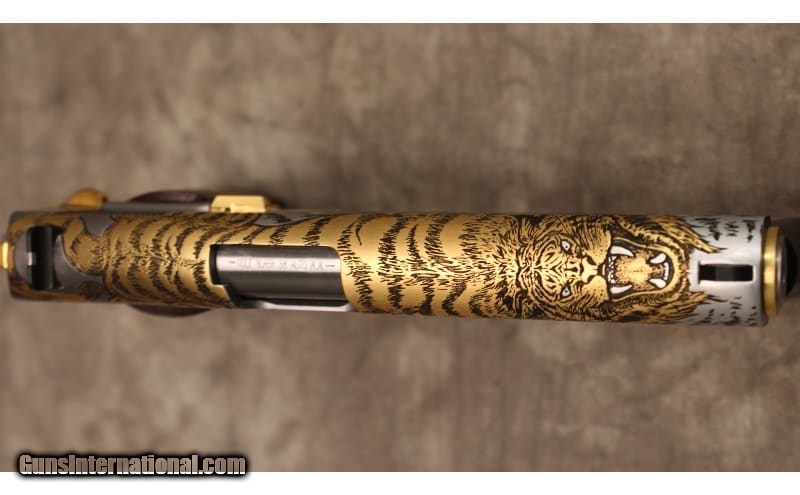 Description: SK Customs releases "LUCHANDO TIGRE," the third production in the Untamed Series of the world's deadliest predators. "LUCHANDO TIGRE" (translated: Fighting Tiger) Luchando Tigre is a limited-edition production run of only (200) Colt 1911 Full-Size Government Models chambered in 38 Super, featuring a semi-polished stainless finish on the slide and frame flats. The tiger is covered in 24k gold with black-filled stripes and selective silver-plated eyes, teeth and claws. The Colt logo decorates the rear left panel, and the right is engraved with each gun's unique issued series number. The production comes complete with a set of rare specimen genuine tiger maple wood grips showing off stripes that go across the grain resembling a tiger's coat with 24k gold Colt Rampart inserts. .38 Super SOLD Wood Condition: New in box Bore Condition: New in box Barrels: 5 Weight: 2LBS Sights: Factory Item Location: Broken Arrow, OK |