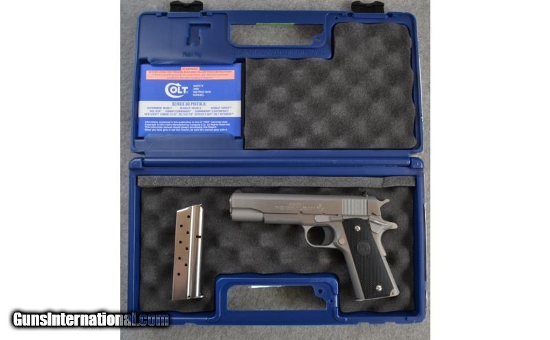 Description: Colt Government Model .38 Super, stainless steel, including factory case and 2 magazines. SOLD Manufacturer: S/N 38SS09780 Caliber Info: Colt .38 Super Auto Metal Condition: Very good condition for age with normal wear and use marks showing. Slight scuffing on left side of receiver. Wood Condition: Grips are in very good condition. Bore Condition: Very Good Condition. Bright and shiny. Good rifling. No pitting or rust noted. Barrels: 5 Inches, stainless steel. Weight: 2 Lbs 6 Oz. Sights: Fixed 3-dot sights. Item Location: Lone Tree, CO |