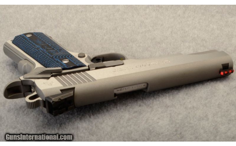 Description: This is a Colt Government Model pistol in .38 Super. Sights are an adjustable rear sight and fixed front fiber optic sight. Metal is in very good condition with slight scratching on rear right of slide and slight discoloration on either side of slide serrations. Grips are Colt 1911 style grips. Bore is in excellent condition with strong rifling. Comes with hard case and one extra magazine. Firearm is used but in overall excellent condition. SOLD Caliber Info: .38 Super. Metal Condition: Very good with slight scratching on rear right of slide and slight discoloration on either side of slide serrations. Wood Condition: Grips are in excellent condition. Bore Condition: Excellent with strong rifling. Barrels: 5 inches, stainless steel. Triggers: Single action only. Stock: Blue Colt 1911 style grips. Weight: 40 ounces. Sights: Adjustable rear sight and fixed front fiber optic sight. Extras: Comes with hard case and one extra magazine. Item Location: Tualatin, OR |