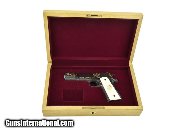 Colt Government Model .45 ACP Engraved by Alvin White. Outstanding Colt Series 70 Government model engraved by Alvin White for well-known gun author and historian R.L. Wilson. The gun has profuse scroll engraving throughout with most of the flats covered in inlaid gold scrolls. There are 3 deep relief gold inlays on the gun, one on the right side of the slide of an airplane, and two on the top of the slide: one is of a rampant Colt and the other of an eagle in flight. The grips have gold ovals inlaid on each side, with one of them engraved with “RLW” for R.L. Wilson. The frame is signed “A.A. White-Eng.” under the grip. A wonderful example of the top notch work by one of the 20th century’s most famous and prolific engravers.