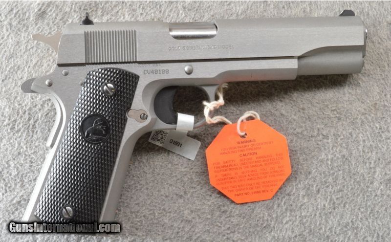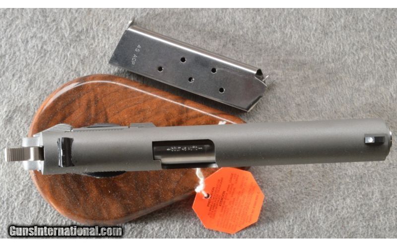 Description: This is an as new Colt Government Model 0 in .45 ACP. The pistol came to us from Lew Horton and looks test fired only. The pistol is stainless steel with a brushed finish and bead blasted top. The pistol comes in the Colt hard case with a lock, gun oil, factory paperwork, hang tags and a second 7 round mag. SOLD Manufacturer: New. Caliber Info: .45 ACP. Chambers: Semi-Auto 7+1. Metal Condition: Like new. Wood Condition: The grips are like new. Bore Condition: Like new. Barrels: 5 inch stainless steel with sights on the slide. Triggers: Single. Stock: Black Colt hard rubber grips. Weight: 2 Lbs. 6 Oz. Sights: Three dot (white). Extras: Comes with a Colt hard case with lock, gun oil, factory paperwork, hang tags and a second 7 round mag. Item Location: Owatonna, MN |