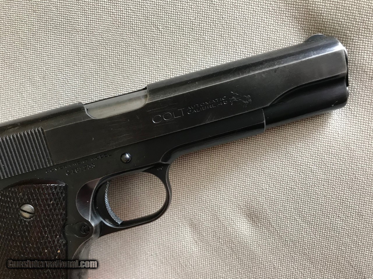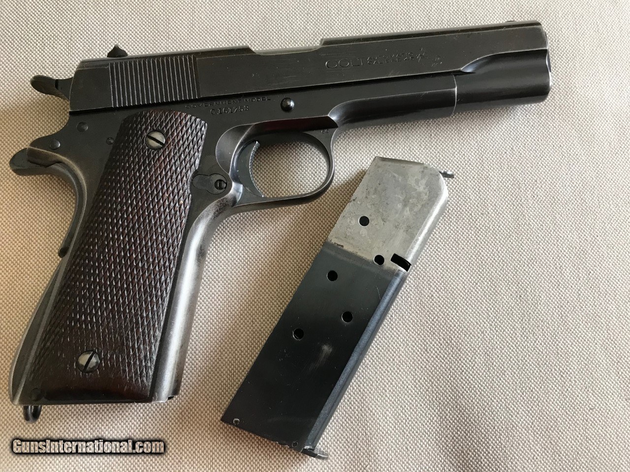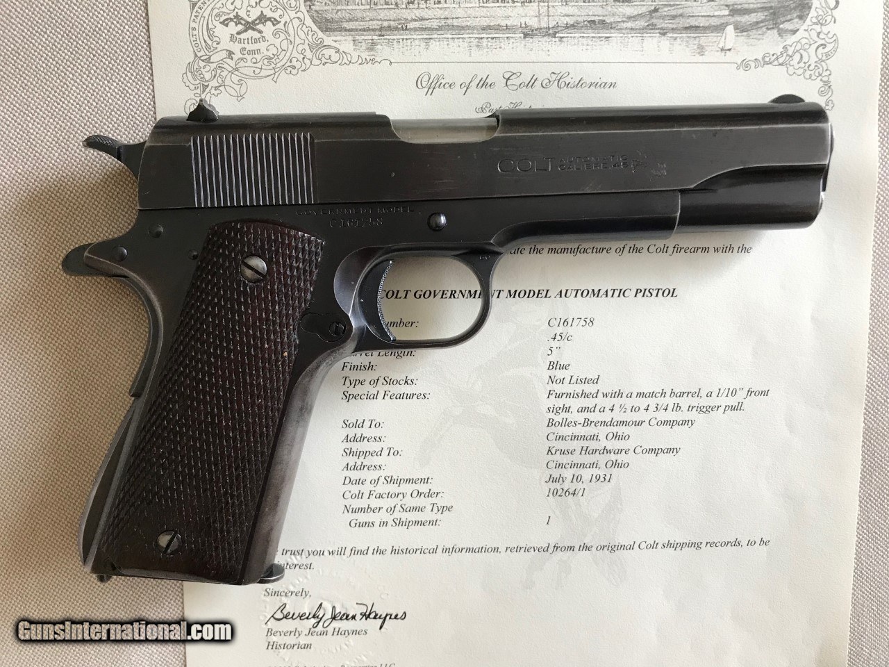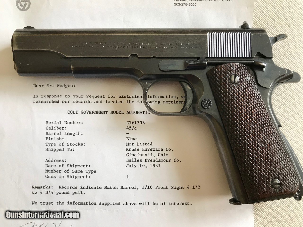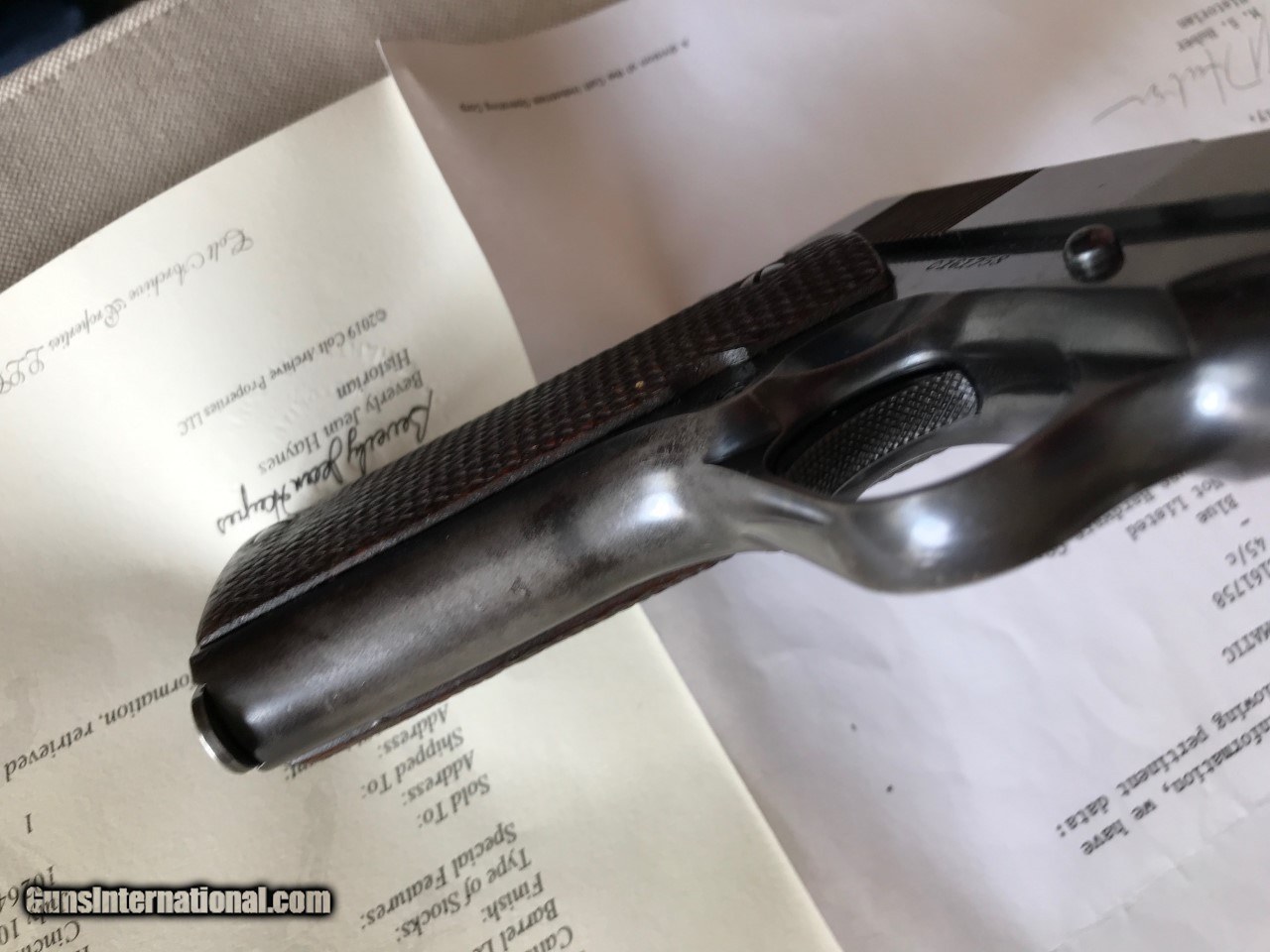 Description: Colt government model .45 acp. SER# 161,758 Mfg 1931 Im calling it a pre national match as per the description.The original National Matches started in 1932.This piece was made just like a National match but with out the two words on the slide saying NationalMatch Two letters on the piece. This piece is a special order gun. per the letter. A one gun shipment. It has a 41/2 lb trigger. a minty bore, a MB in a circle on the left lug making it a match barrel. A wide front sight like match guns .The slide is numbered to the frame. all the internal parts are in the polished white just like the super match and the National matchs. It functions perfect and is very accurate. The finish is all original with some wear on the front strap and left side of the slide . It still retains a lot of finish for its age. Original grips, screws, and original correct magazine.A tight clasic 1911a1 Colt . Any Questions call Me Tom 612 859 5673 Need a FFL or C+R license , ( sold sale pending ) SOLD Curio/Relic: Yes Handgun Caliber: .45 ACP (.45 Auto) |
