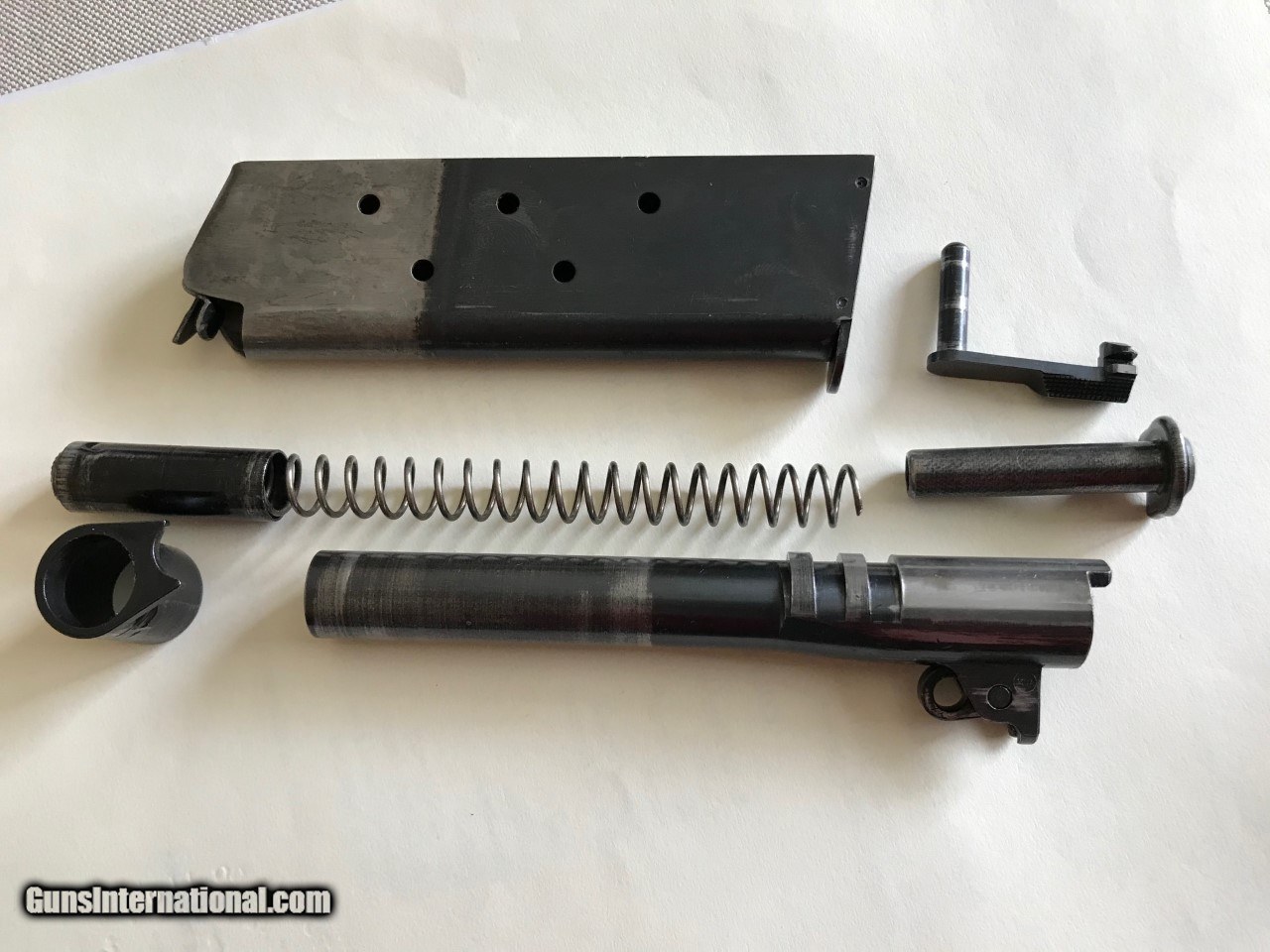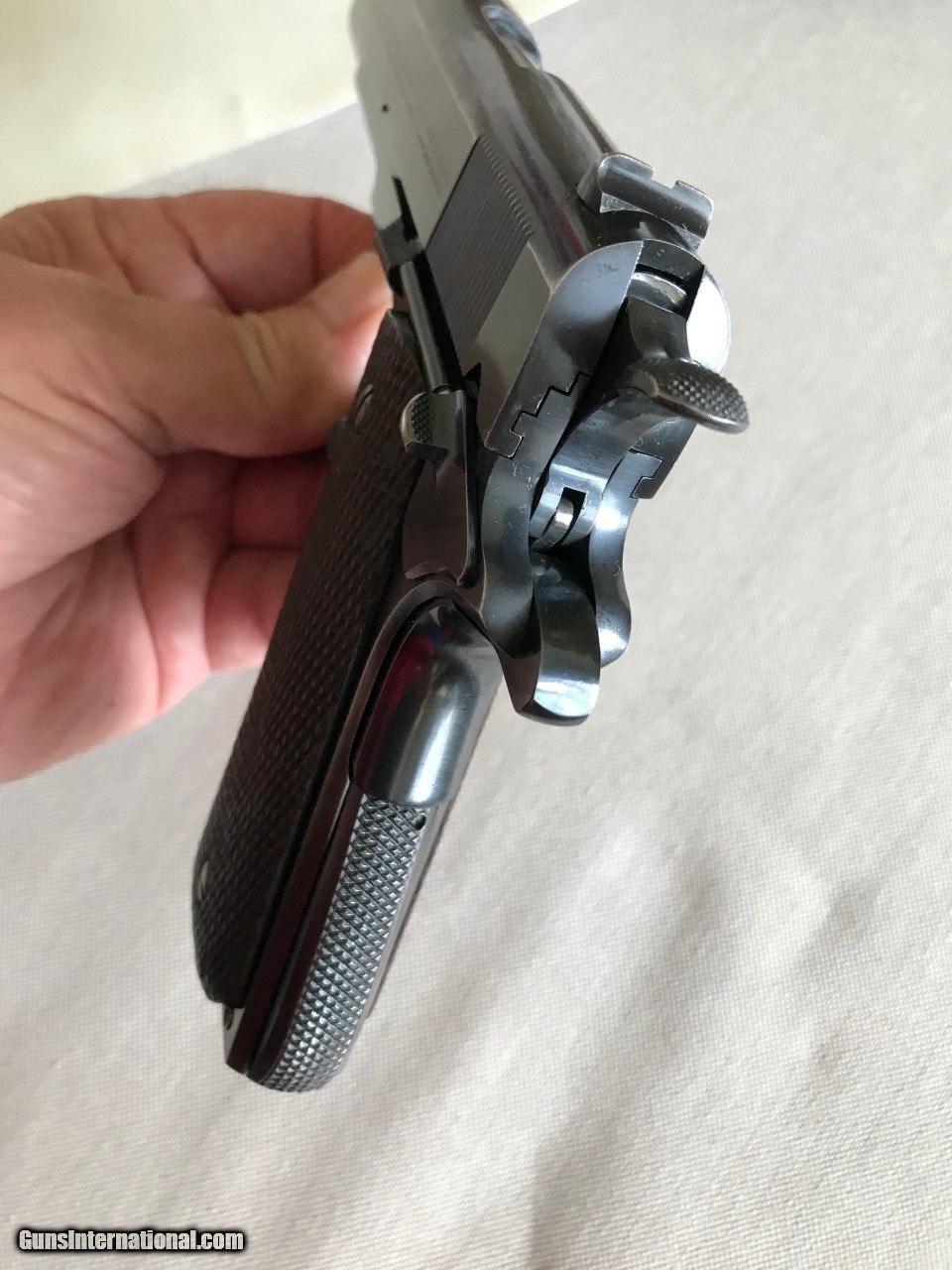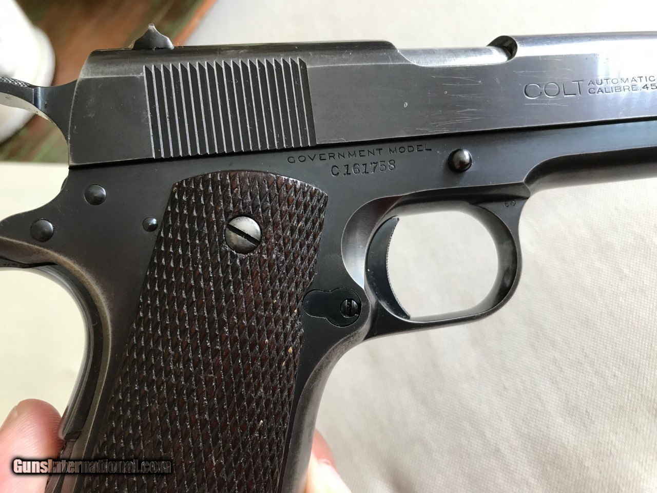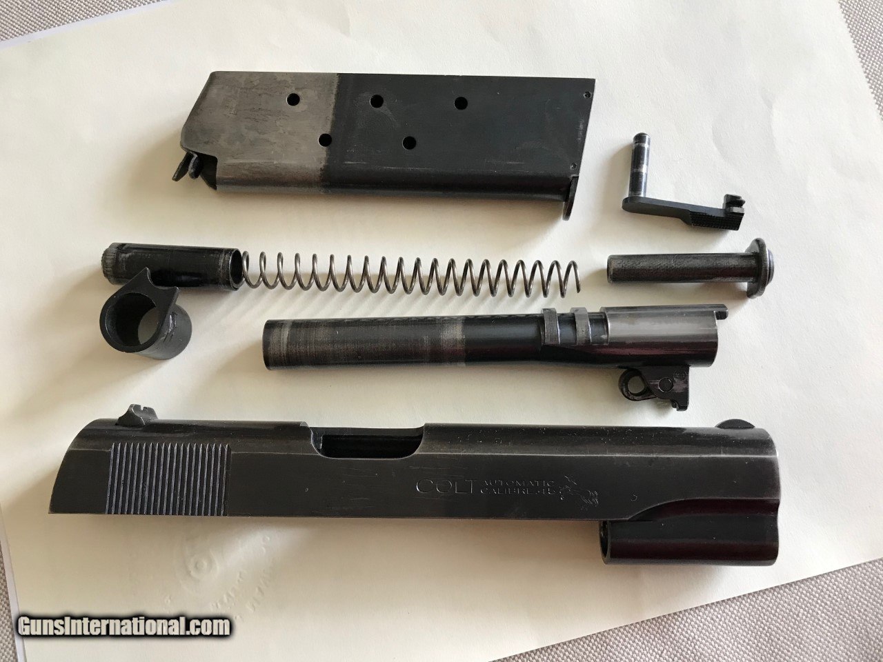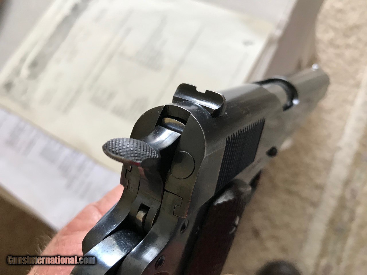 Description: Colt government model .45 acp. SER# 161,758 Mfg 1931 Im calling it a pre national match as per the description.The original National Matches started in 1932.This piece was made just like a National match but with out the two words on the slide saying NationalMatch Two letters on the piece. This piece is a special order gun. per the letter. A one gun shipment. It has a 41/2 lb trigger. a minty bore, a MB in a circle on the left lug making it a match barrel. A wide front sight like match guns .The slide is numbered to the frame. all the internal parts are in the polished white just like the super match and the National matchs. It functions perfect and is very accurate. The finish is all original with some wear on the front strap and left side of the slide . It still retains a lot of finish for its age. Original grips, screws, and original correct magazine.A tight clasic 1911a1 Colt . Any Questions call Me Tom 612 859 5673 Need a FFL or C+R license , ( sold sale pending ) SOLD Curio/Relic: Yes Handgun Caliber: .45 ACP (.45 Auto) |
