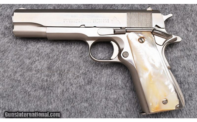 Description: This Colt Government model has the -C suffix at the end of the serial number. In great condition showing very little use. Nickle frame and slide with the mother of pearl grips make this a striking pistol. Complete with original cardboard box and Colt information sheet. .45 Auto SOLD Metal Condition: Excellent Bore Condition: Excellent Barrels: 5 Triggers: Factory Fore End: Mother of Pearl Grips Weight: 44 oz. Sights: Fixed Blade Front - Dovetail Adjustable Rear Item Location: Wheeling |