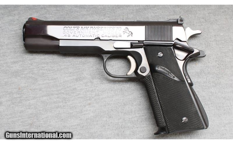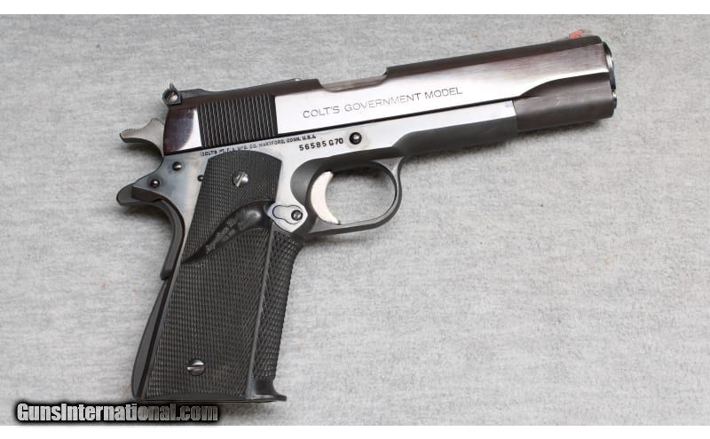 Description: Excellent condition, light finish wear, few small scratches. NOTE - there is no magazine with this pistol. Classic Colt Series '70 Government Model 1911 pistol. 5" Barrel, adjustable sights, standard safety lever and grip safety and pachmayr hard rubber grips. .45 Auto SOLD Chambers: Semi auto Metal Condition: Excellent Bore Condition: Bright Barrels: 5 Triggers: Single action Butt Pad: Pachmayr grips Sights: "Adjustable rear, red insert front sights Item Location: La Vista, NE |
