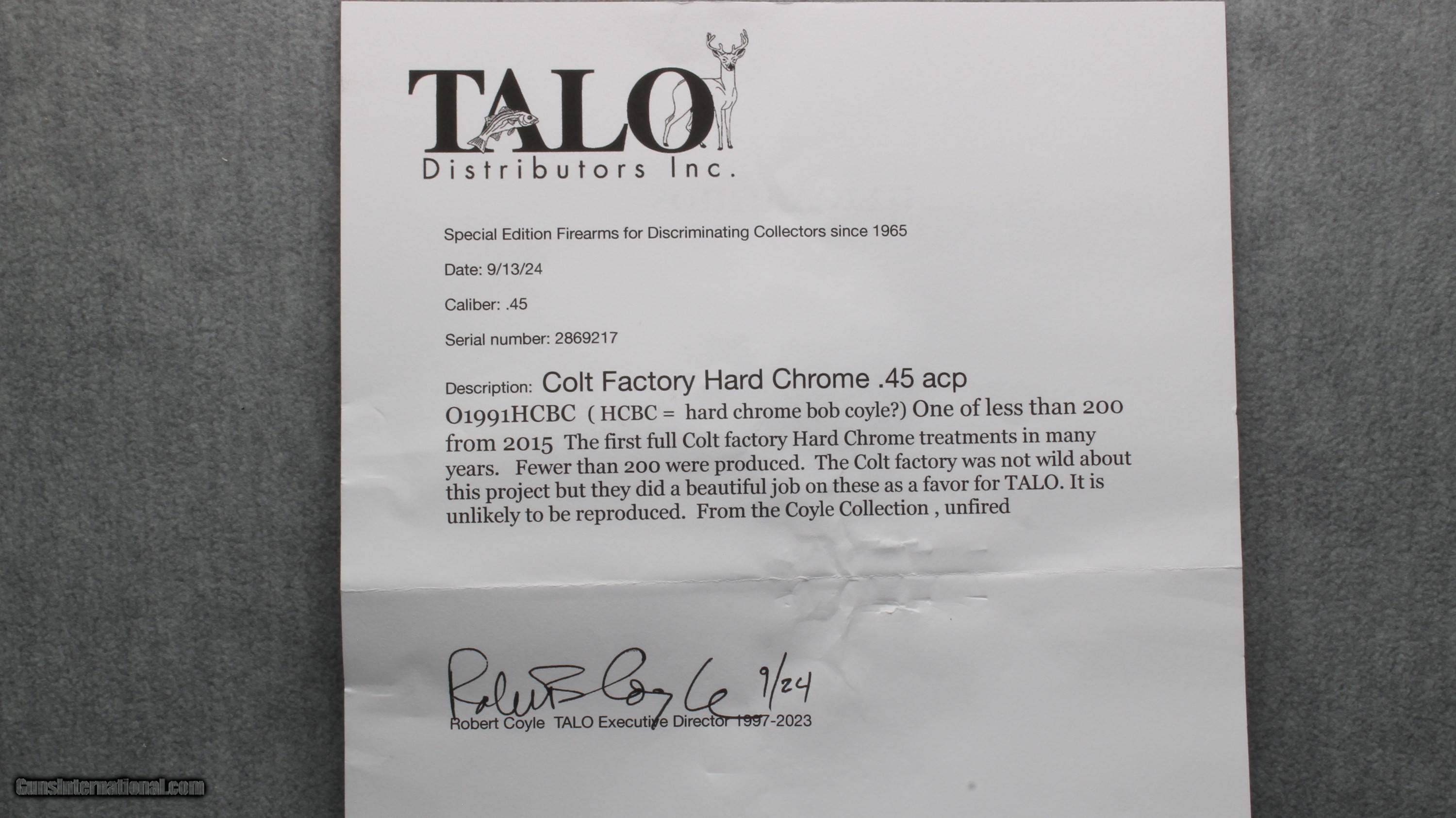 Description: Scarce Factory Hard Chrome Finished Colt Government Model , chambered in .45acp. This was a special Talo production run of less than 200 pistols back in 2015. The complete "New In Box" package, remains in unfired condition with no detractions or handling marks of any kind. Includes letter from Talo confirming the original configuration and production run. Not much more to say. Price includes free shipping to your FFL dealer... Handgun Caliber: .45 ACP (.45 Auto) Manufacturer: Colt Model: Government (01991HC) Serial Number: 2869217 Barrel Length: 5 Condition: New In Box Finish: Hard Chrome Item Location: Arizona Price: $2,250.00 Contact Seller |