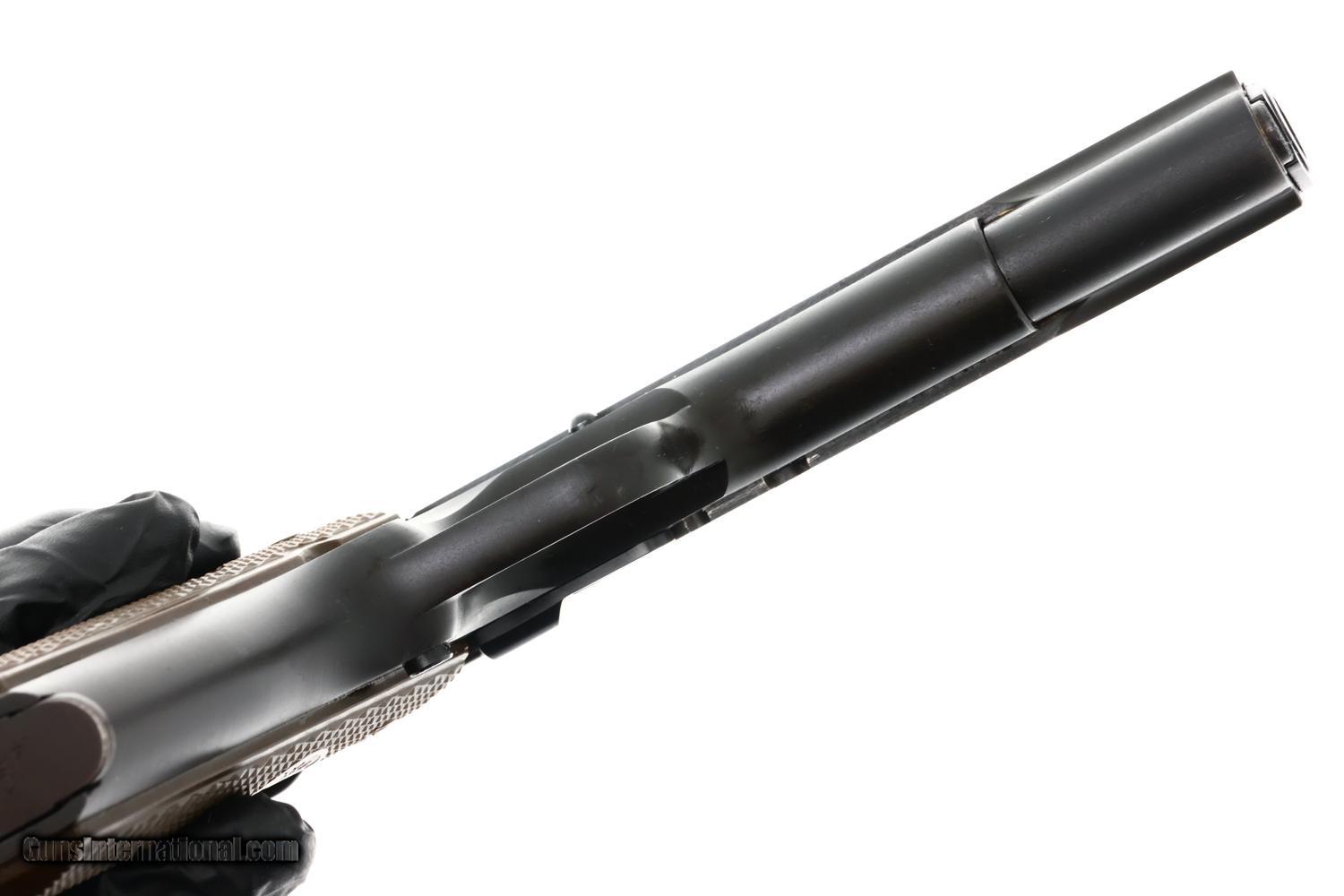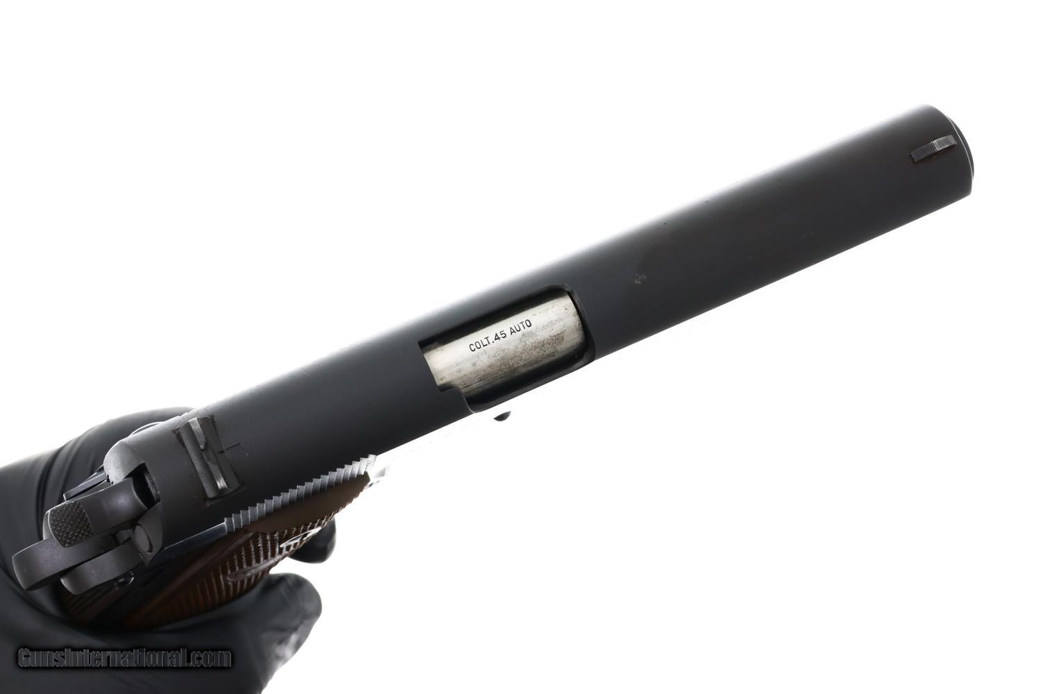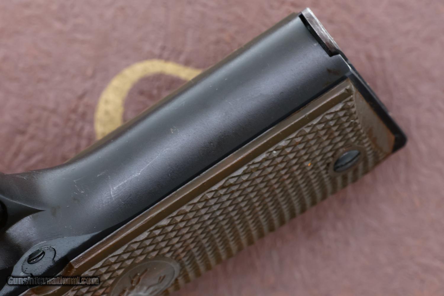Description: Synopsis: Fascinating Colt Government Commercial pistol from 1951 earmarked to the State of Connecticut Military Department, State Armory Property and Procurement Division in Hartford, Connecticut. A wonderful, high condition and all-original pistol in correct shipping box with factory literature and original factory letter supporting its military association. Description: Standard configuration Colt Government Model .45 pistol, SN: 248450-C, made 1951, blue finish with 5" barrel, fixed front sight with drift adjustable rear sight. Left side of slide marked "GOVERNMENT MODEL COLT AUTOMATIC CALIBER .45" with rampant Colt logo, while right side of slide bears "COLT'S MFG. CO. HARTFORD CT. U.S.A" with serial number "248450-C" on the frame. Fitted with brown checkered Coltwood grips displaying rampant Colt logo. Blued magazine marked "COLT .45 AUTO" on base, with 5 indicator holes. Complete with original brown-textured factory box featuring handwritten "Sgt Stannard" and "248-363-C" with red rampant Colt stamp on lid interior, serial number handwritten (barely visible) on bottom of box, with original instructional literature, Colt factory letter showing shipment to Military Dept, State Armory Property and Procurement Division, Hartford, CT, and cleaning brush. Condition: Crisp 99+% bright original factory blue with minor sharp edge wear at muzzle and forward frame. Minimal operational scuffing on exposed barrel hood. Bright sides of hammer with light staining more pronounced on right side. Coltwood grips with just the most minor handling marks. Magazine with negligible insertional wear. Mirror bright bore. Correct manual mechanics. VG box, lid with a split corner, moderate shelf wear and losses to end label as carefully imaged. EXC factory letter. Curio/Relic: Yes Manufacturer: Colt Model: Government .45 Serial Number: 248450C Caliber Info: 0.45 Condition: EXC Price: $7,995.00 Contact Seller |