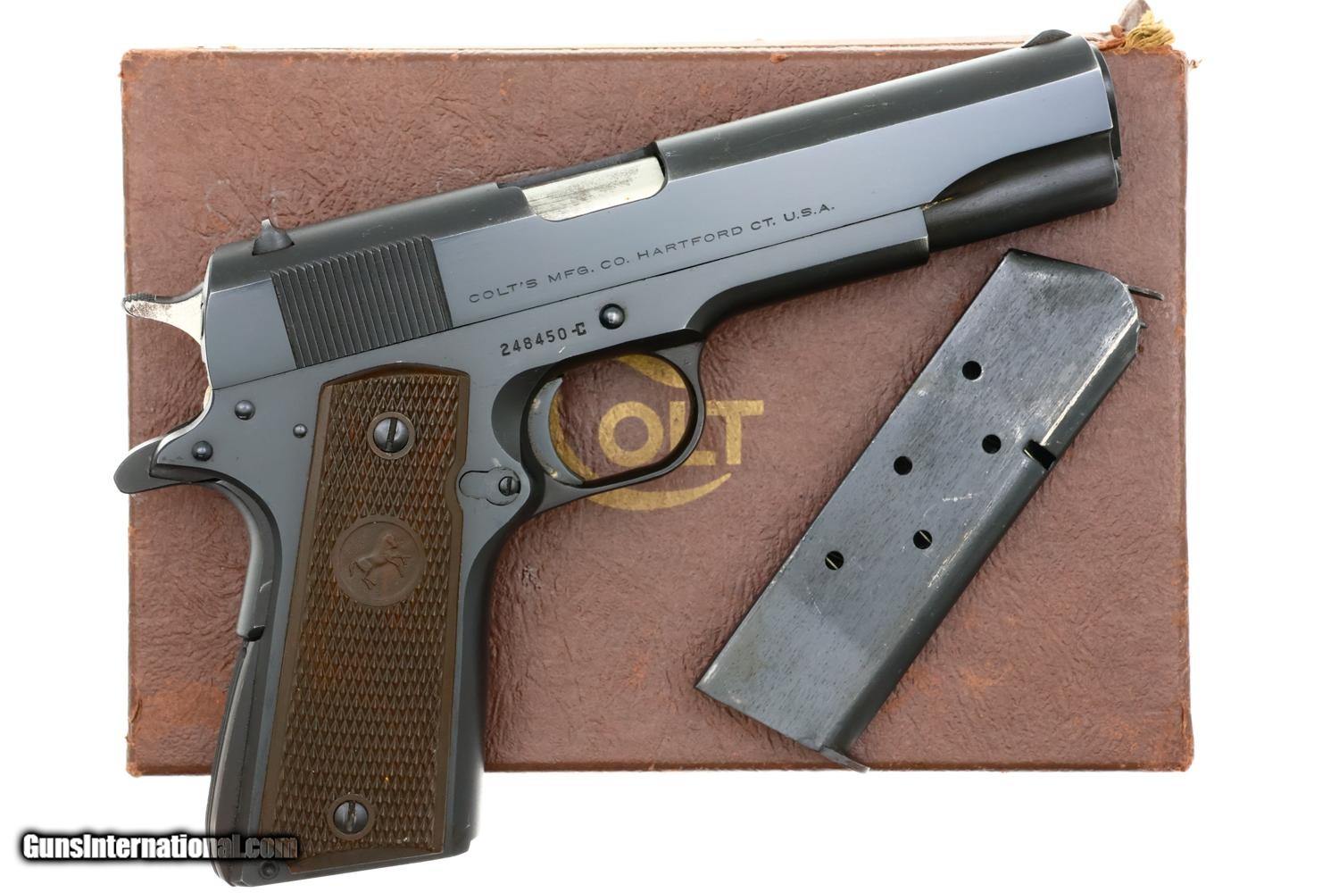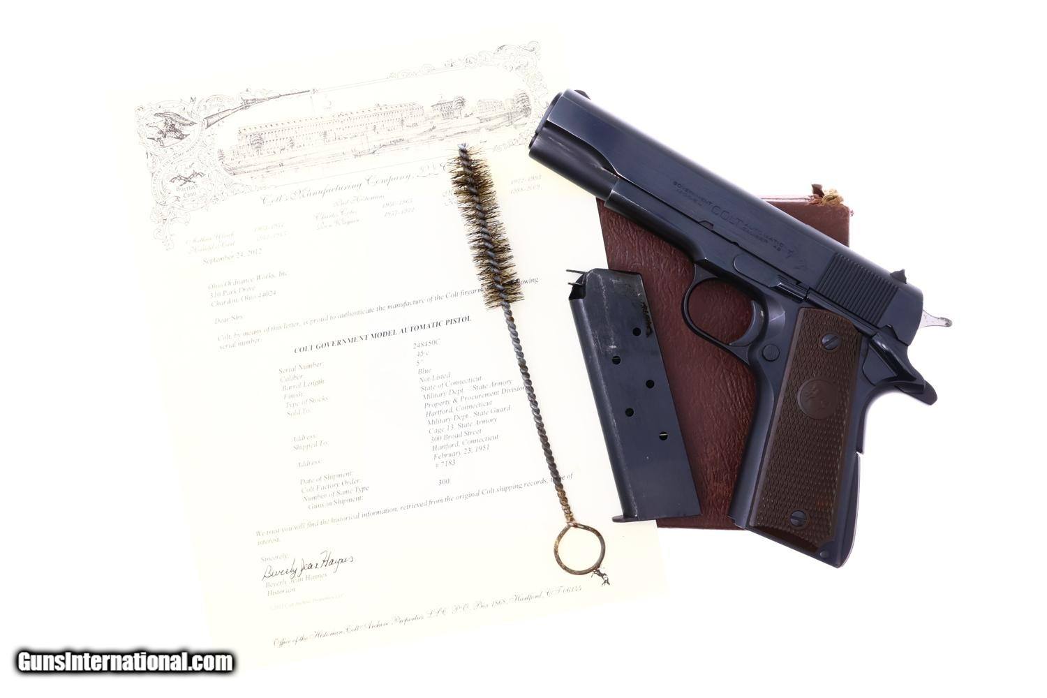 Fascinating Colt Government Commercial pistol from 1951 earmarked to the State of Connecticut Military Department, State Armory Property and Procurement Division in Hartford, Connecticut. A wonderful, high condition and all-original pistol in correct shipping box with factory literature and original factory letter supporting its military association.