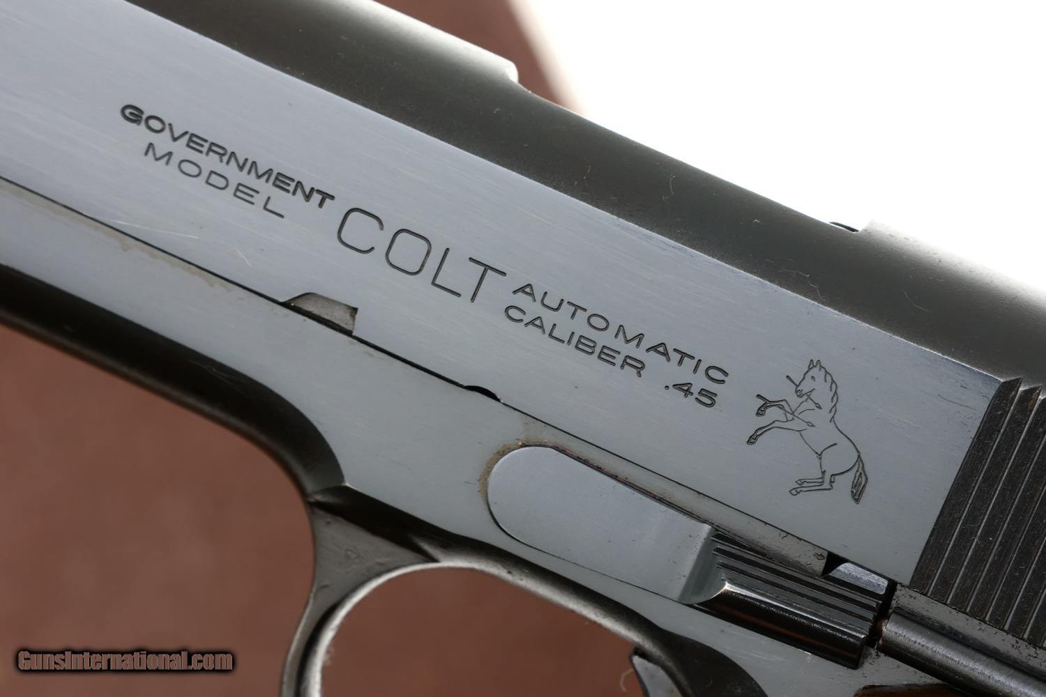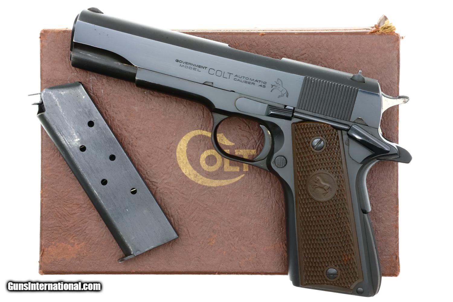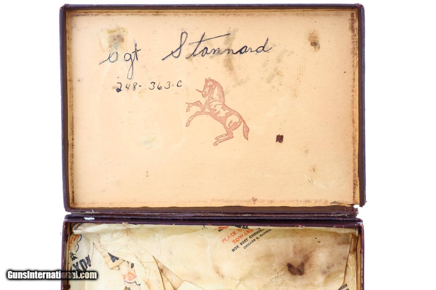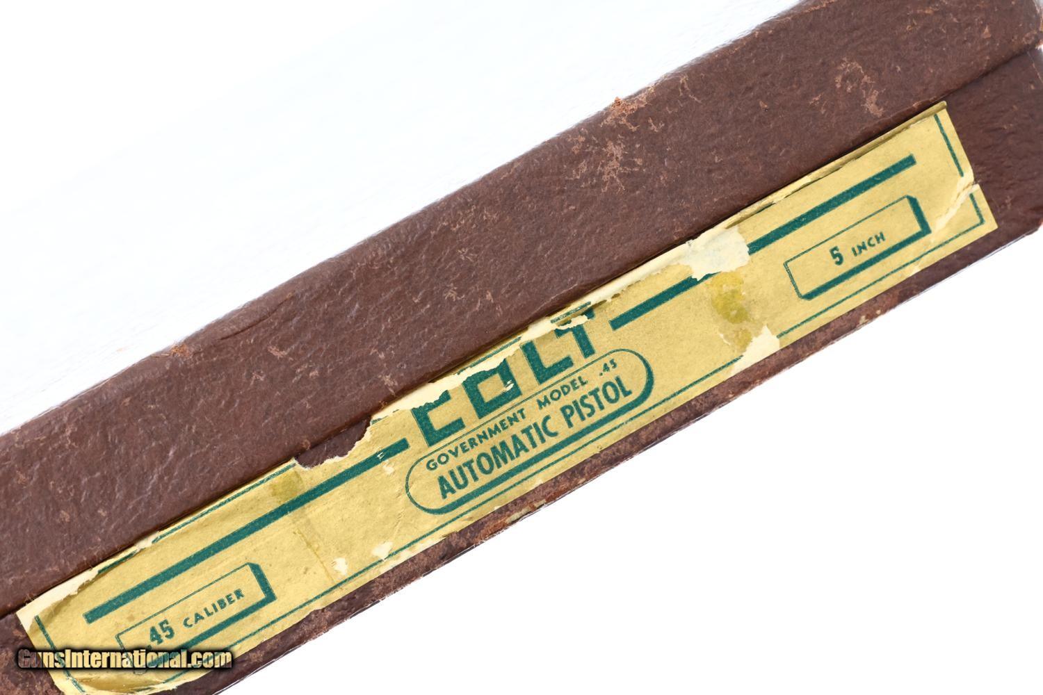 Standard configuration Colt Government Model .45 pistol, SN: 248450-C, made 1951, blue finish with 5" barrel, fixed front sight with drift adjustable rear sight. Left side of slide marked "GOVERNMENT MODEL COLT AUTOMATIC CALIBER .45" with rampant Colt logo, while right side of slide bears "COLT'S MFG. CO. HARTFORD CT. U.S.A" with serial number "248450-C" on the frame. Fitted with brown checkered Coltwood grips displaying rampant Colt logo. Blued magazine marked "COLT .45 AUTO" on base, with 5 indicator holes. Complete with original brown-textured factory box featuring handwritten "Sgt Stannard" and "248-363-C" with red rampant Colt stamp on lid interior, serial number handwritten (barely visible) on bottom of box, with original instructional literature, Colt factory letter showing shipment to Military Dept, State Armory Property and Procurement Division, Hartford, CT, and cleaning brush.