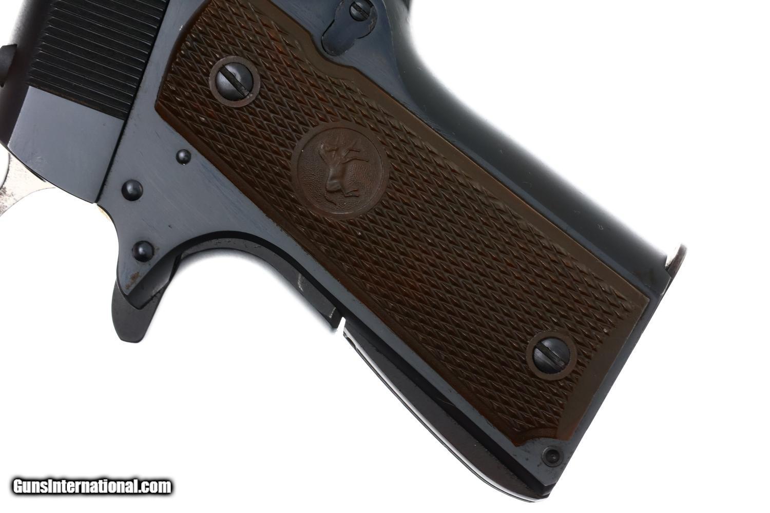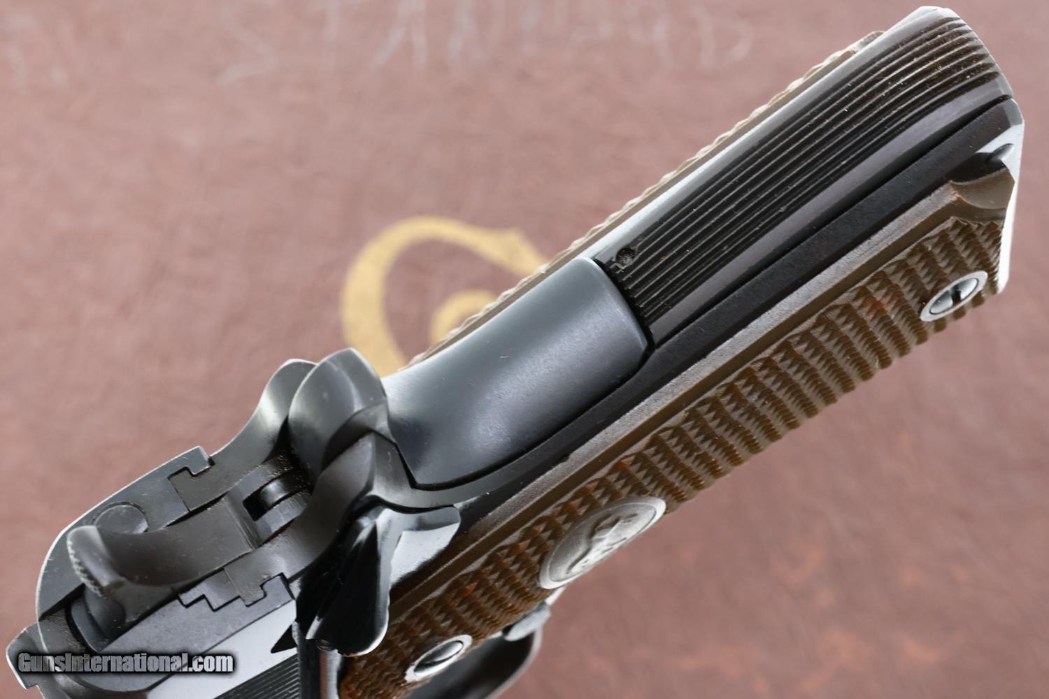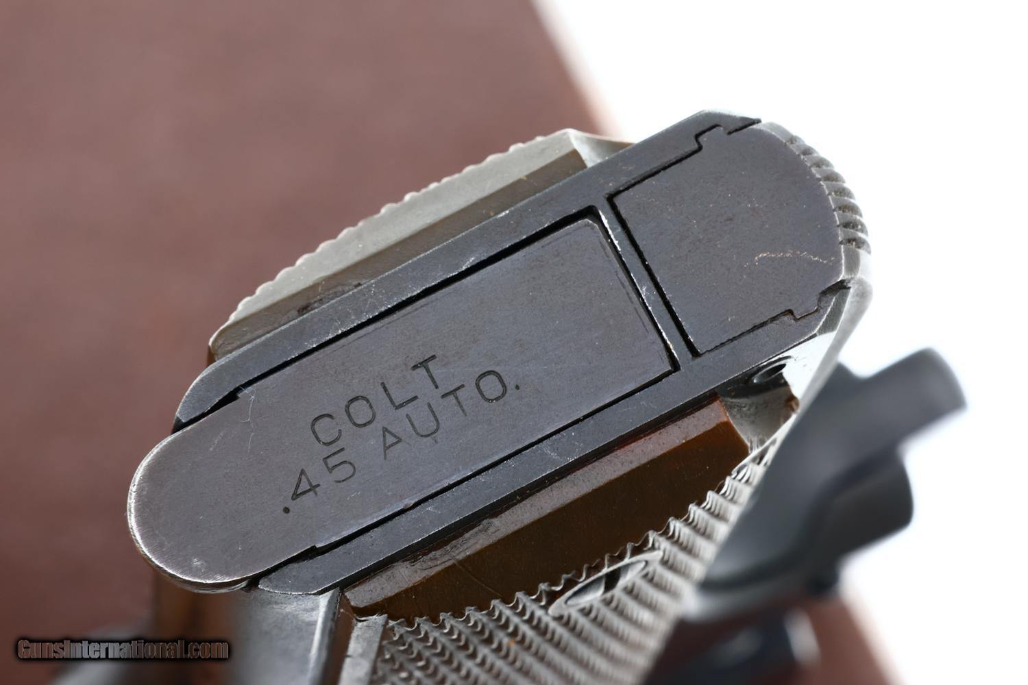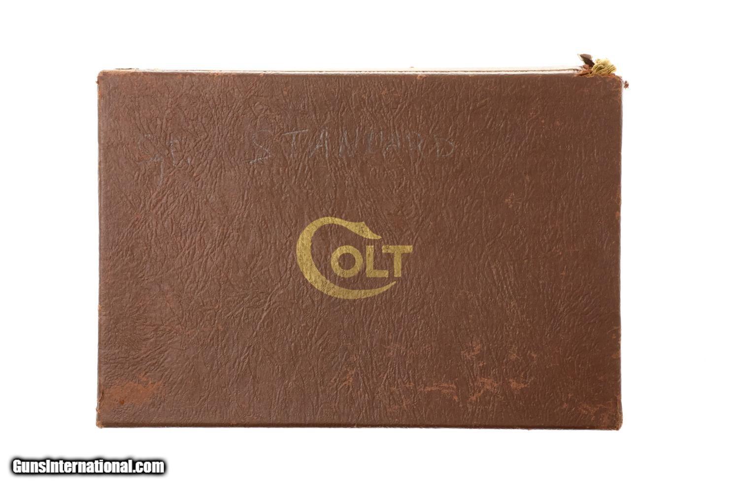 Crisp 99+% bright original factory blue with minor sharp edge wear at muzzle and forward frame. Minimal operational scuffing on exposed barrel hood. Bright sides of hammer with light staining more pronounced on right side. Coltwood grips with just the most minor handling marks. Magazine with negligible insertional wear. Mirror bright bore. Correct manual mechanics. VG box, lid with a split corner, moderate shelf wear and losses to end label as carefully imaged. EXC factory letter.
