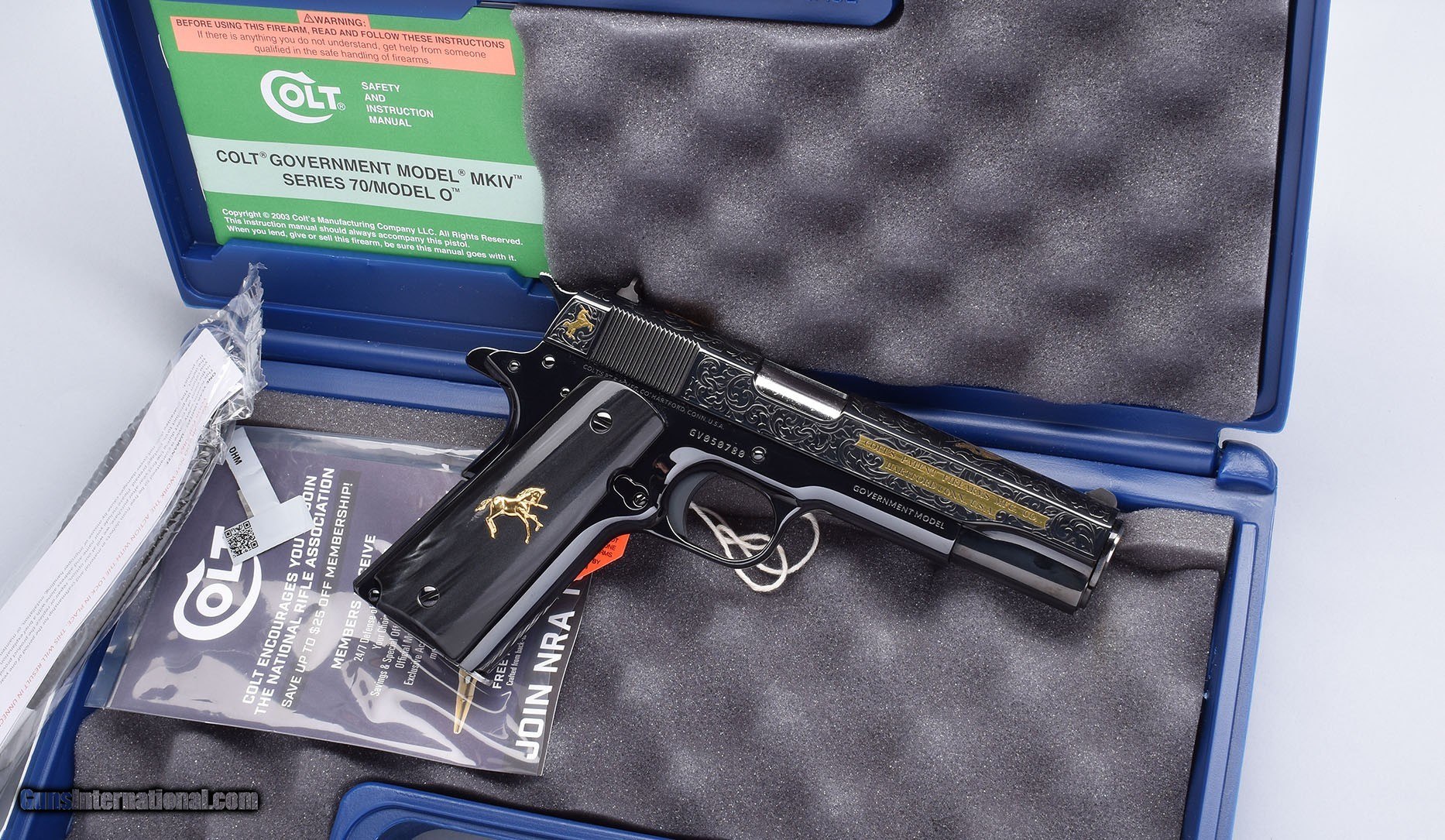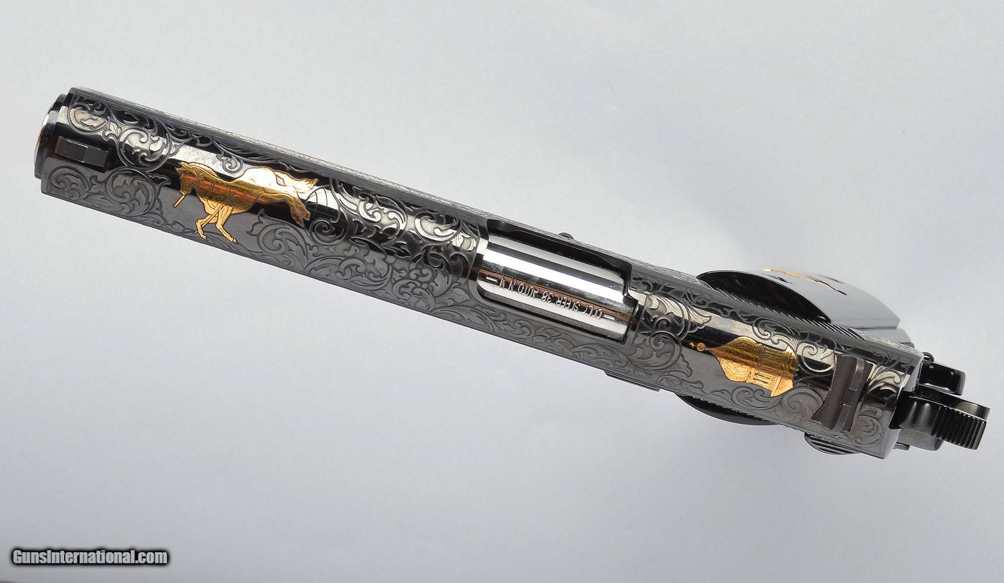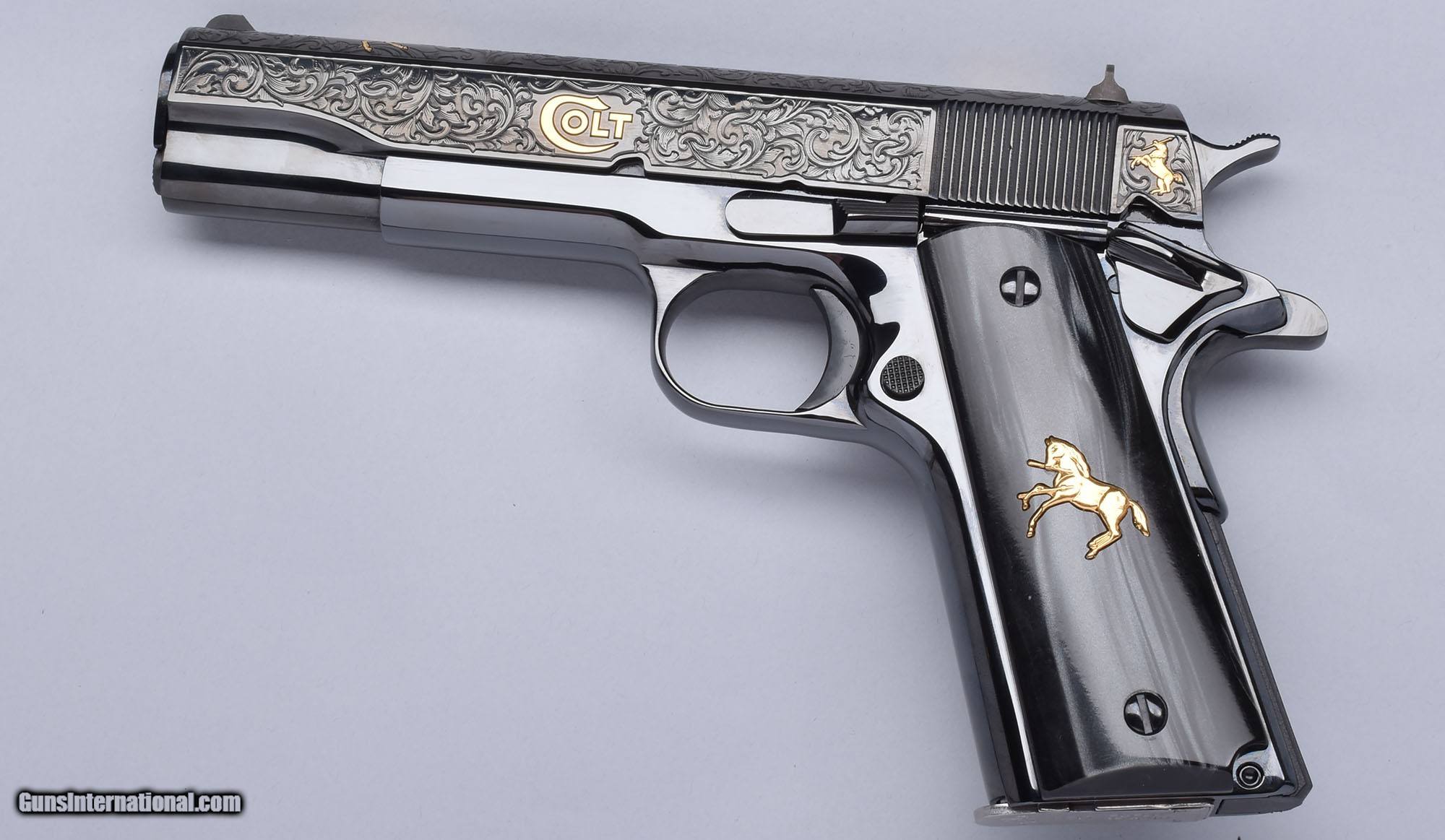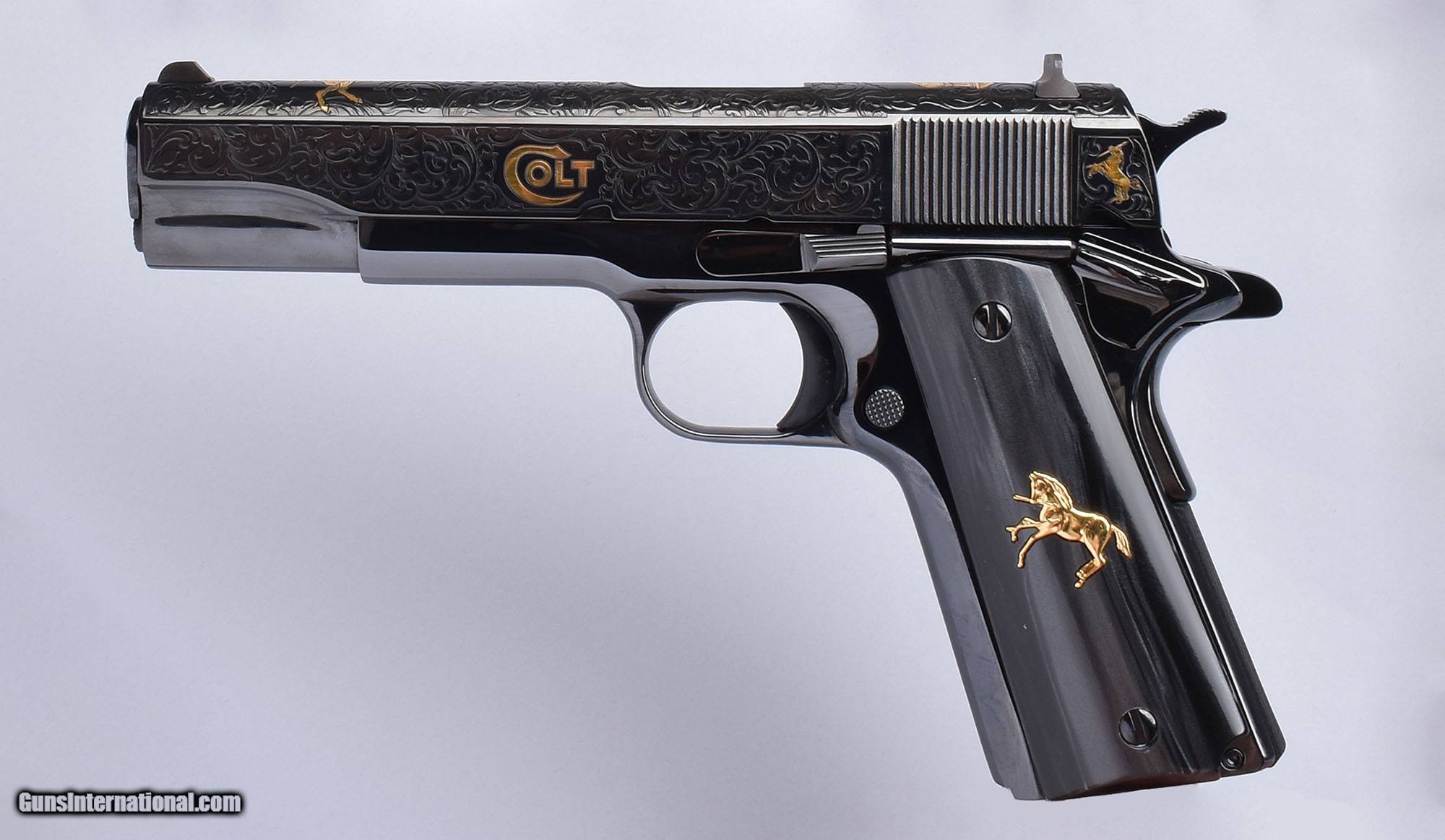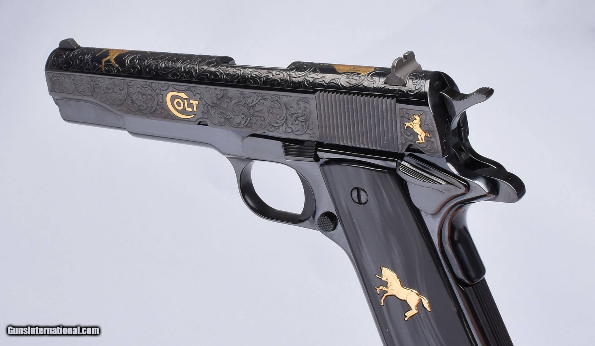 Description: Colt 1911 "Potro Oro" 38 Super Government. Limited to only 500 pieces these Davidson's exclusive 1911s feature specially fitted National Match grade barrels, high polished blue finish with scroll engraved slides. Accenting the pistol are 24k gold-plated Rampant Colts on the top, right and left side of the slide and raised inlays on the Black Pearlite grip panels. Also in gold, an image of the Colt Dome that sat atop the Colt factory since 1855. Very limited availability. New in Factory box. SOLD Handgun Caliber: .38 Super Auto Manufacturer: Colt Metal Condition: High Polished Blue, Scroll Engraving Bore Condition: New Finish: High Polished Blue, Scroll Engraving Sights: Dovetailed Rear Sight, Blade Front |