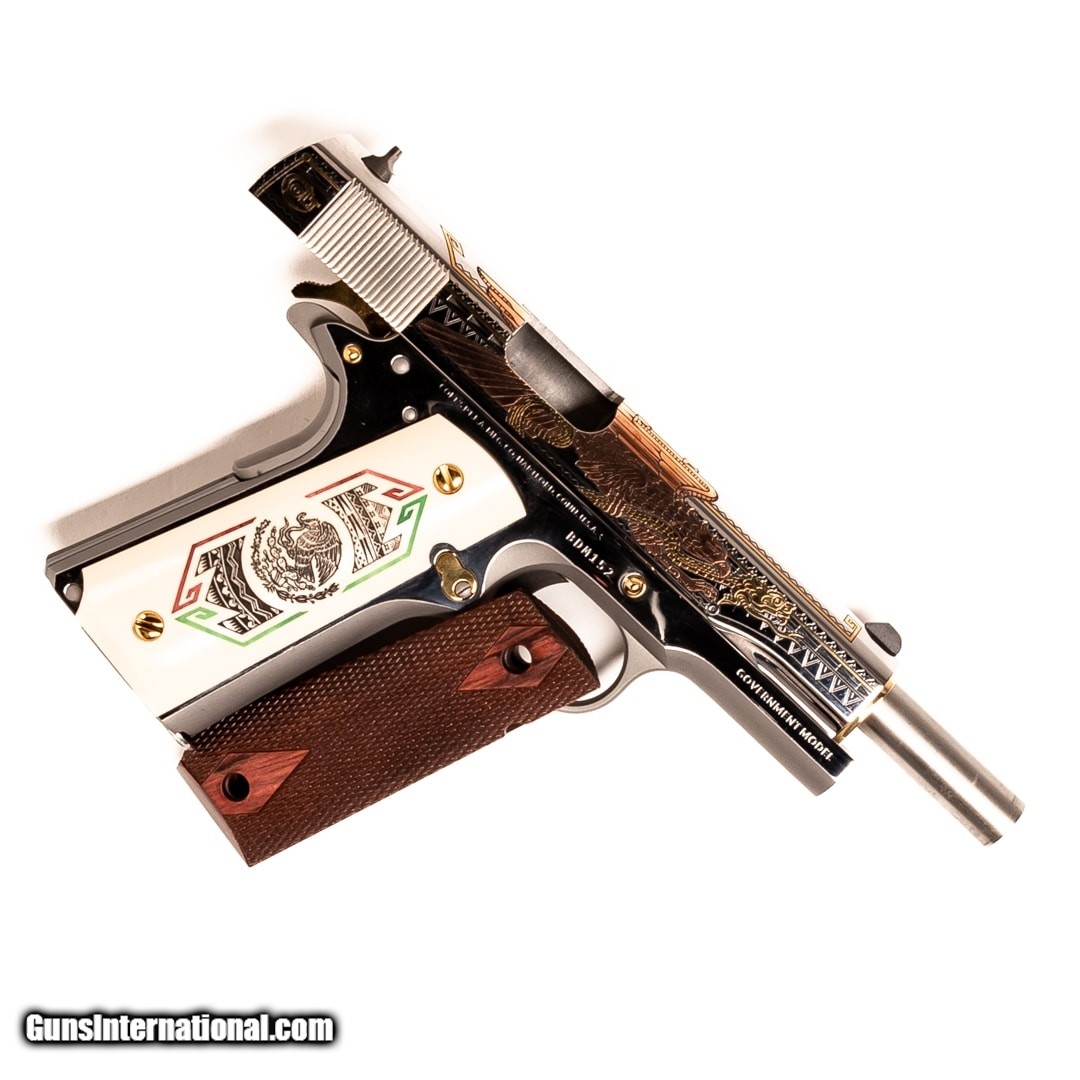 Description: Guns Listing ID: 662729 The Colt Government Model is the evolution of John Browning’s iconic 1911 designed over a century ago. This tried-and-true pistol is a fantastic collector piece, self-defense sidearm, and recreational shooter. This is the Government Model is a Competition series and is well suited for those running handguns at competitions. This handgun is #152 out of 500 and is a Mexican commemorative model chambered in .38 Super and features 24K Gold and Copper inlay along with intricate engravings. There is one 9-round magazine and a custom hard case included. Get the best bang for your buck when you get a Certified Used Firearm . When you see the Certified Used stamp on any of our firearms, you can be confident that you’re getting exactly what you want – a gun only in very good to excellent condition and held to the highest quality standard. All Certified Used Guns come with a ‘no questions asked’ return policy . PLUS, ALL CERTIFIED USED GUNS SHIP FREE! SOLD Manufacturer: COLT Model: GOVERNMENT MODEL Caliber Info: .38 SUPER Condition: Used - Certified Barrels: 4.7 barrel Finish: CUSTOM |