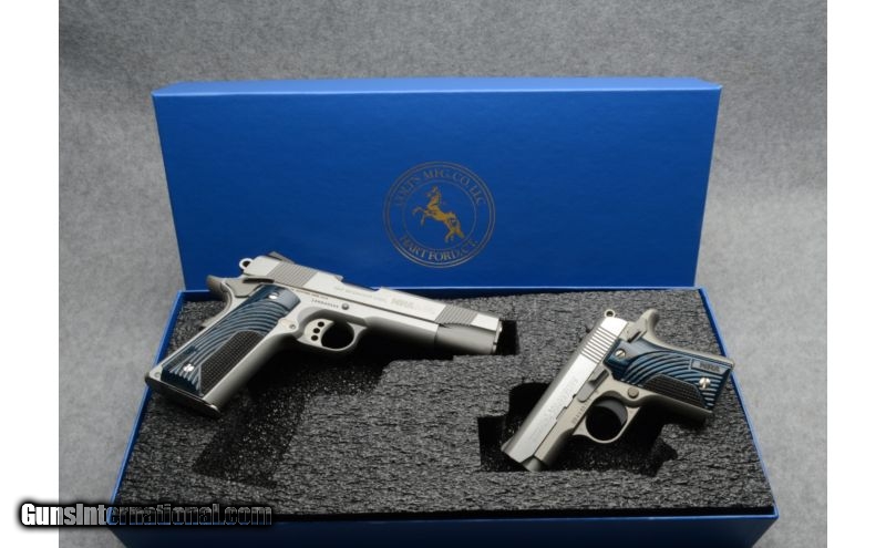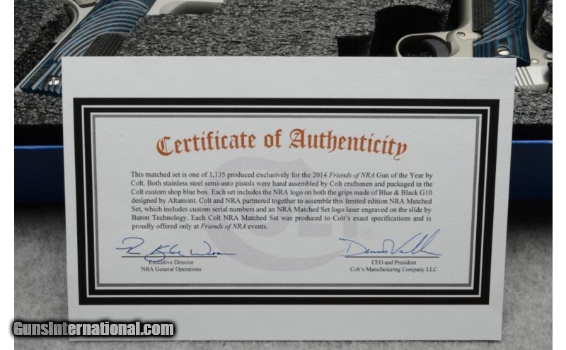 Description: Like new, Never shot, Beautiful set. SOLD Caliber Info: .45 ACP. Chambers: 7 Rounds. Metal Condition: Excellent Bore Condition: Excellent Bright Barrels: 5 Inch. Triggers: Single Stock: Blue textured with embossed NRA logo. Weight: 2 Pounds 10 Ounces. Sights: Three dot Adjustable rear, blade front. Extras: Box set Each gun cost $1,699.99 for total of $ 3,399.98Second gun is the Colt Mustang Pocket light .380 ACP. (Item # 5197964) Item Location: Noblesville, IN |