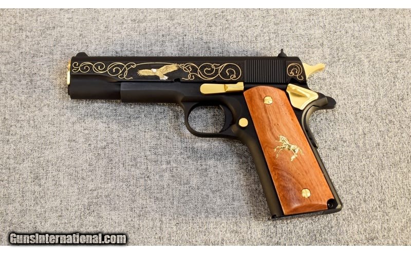 Description: This is a Talo exclusive Colt Government Spirit of America limited edition in .45 ACP, number 228 of 500 featuring a soaring bald eagle on the slide, Mt. Rushmore on the other side of the slide, gold vine scrollwork and gold-plated hammer, barrel bushing, safety, slide stop, magazine release and grip screws .45 ACP SOLD Metal Condition: As new in box Wood Condition: As new in box Bore Condition: Clean with bright lands Barrels: 5 Triggers: SA Butt Pad: Smooth cherry grips Weight: 2 Lbs. 4 Oz. Sights: "Blade front, U-notch rear Item Location: Glendale, AZ |