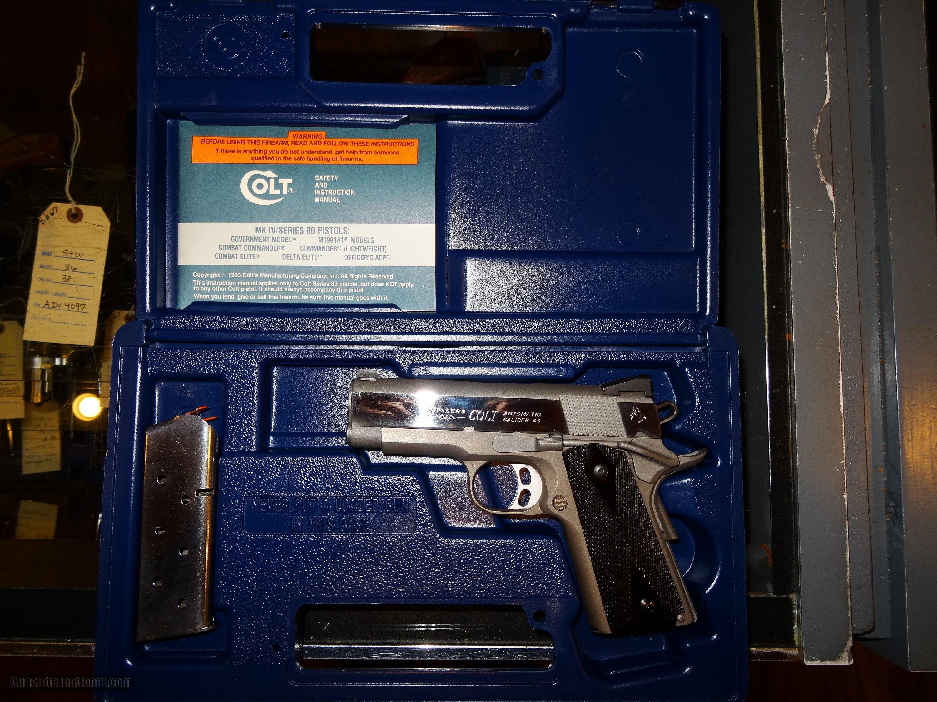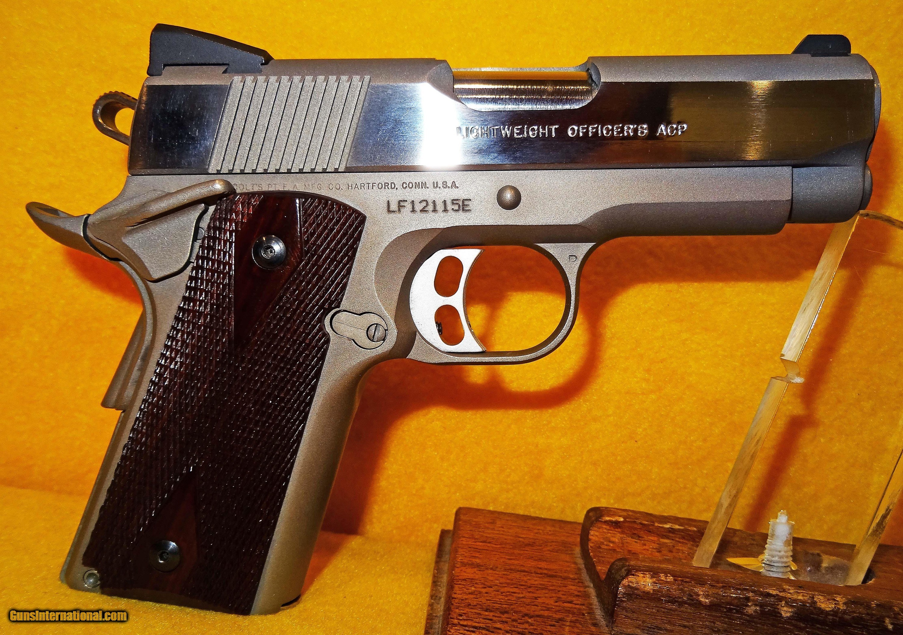 Description: COLT LIGHT WEIGHT OFFICERS MODEL IN .45 ACP CAL., WITH 3 1/2" BARREL. COLOR STAINLESS STEEL. CONDITION 98% LIKE NEW. SERIAL NUMBER LF12115E. COLT MODEL LIGHT WEIGHT OFFICERS MODEL, MIRROR BORE, DIAMOND WALNUT GRIPS EXCELLENT, COMES WITH ONE SPARE MAGAZINE, HARD CASE, PAPERS, 98% LIKE NEW OVERALL CONDITION, OUR STOCK # D741. SOLD |